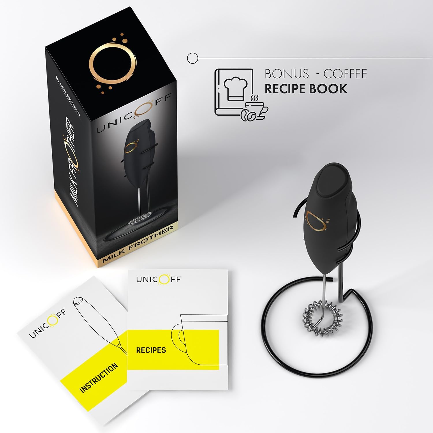 Milk Frother Matte Black - Coffee Frother Handheld with Electric Whisk - 19000 rpm - Book Recipes and Stainless Steel Stand Included - Hand Mixer Electric (Matte Black Onyx)