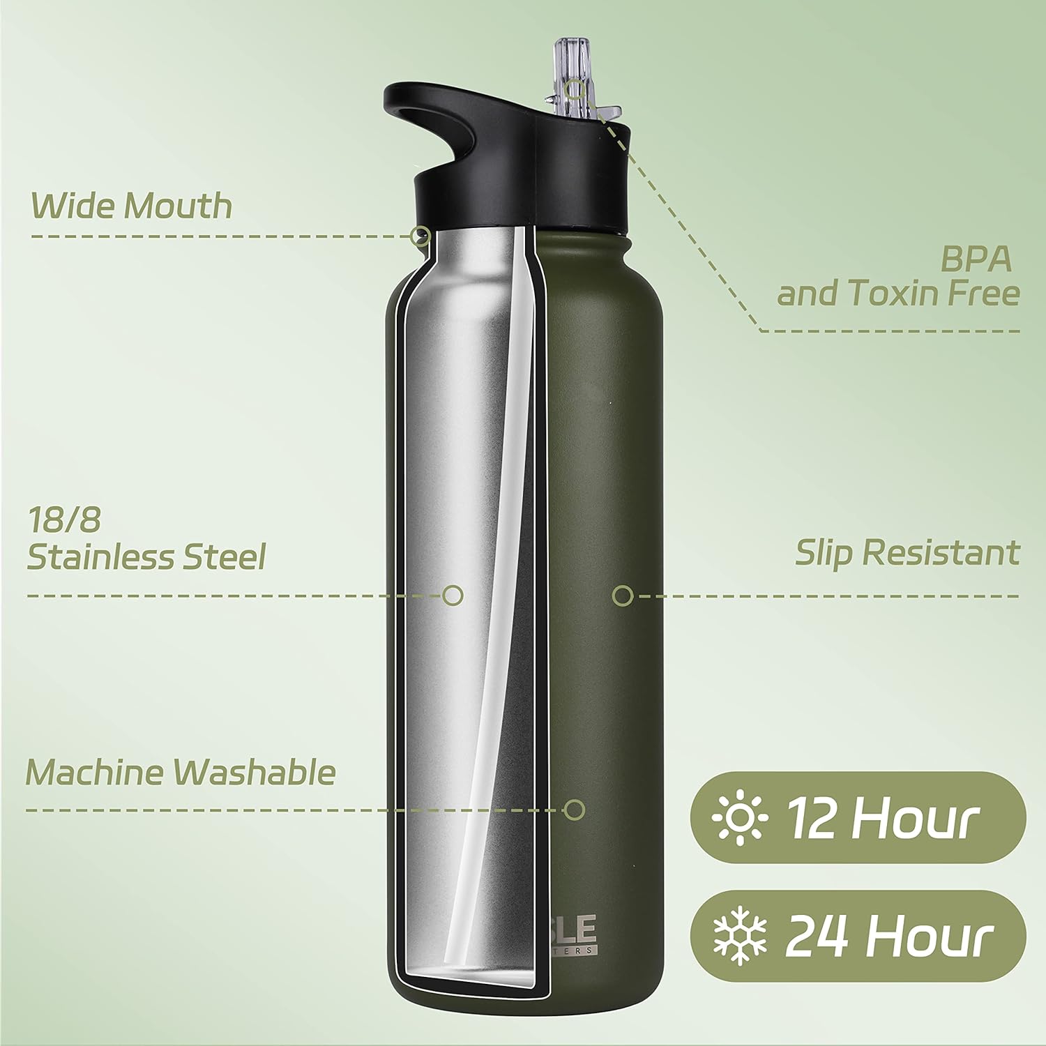 HASLE OUTFITTERS 40oz Stainless Steel Water Bottle, Vacuum Insulated Double Walled Leak Proof Sports Water Bottle with 2 Lids (Straw and Spout Lid) Thermo Mug Keep Cold and Hot(Army Green,4)