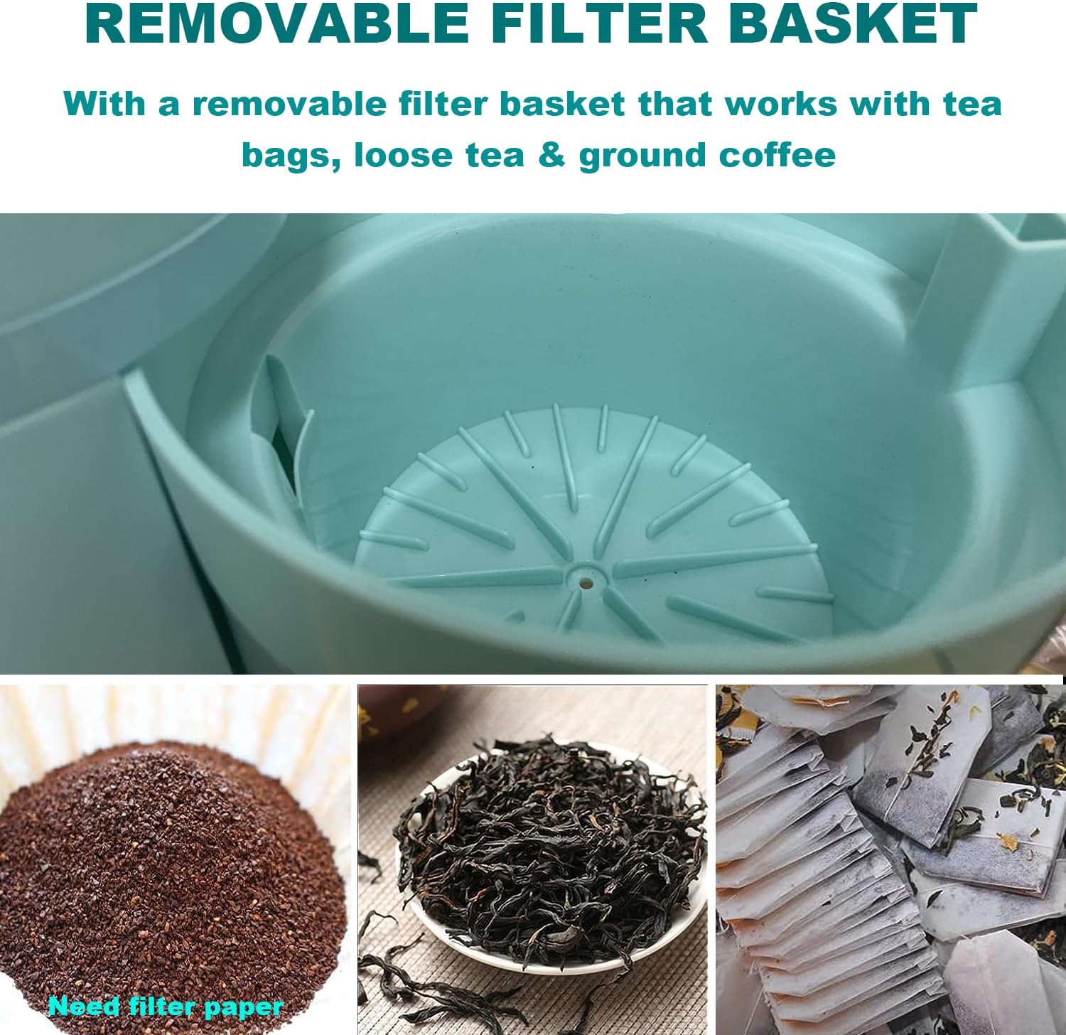 - ăRemovable Brew BasketăThe removable basket works with fresh ground coffee, tea bags and loose leaf teas, while the shower head is designed for complete saturation and optimal flavor extraction.