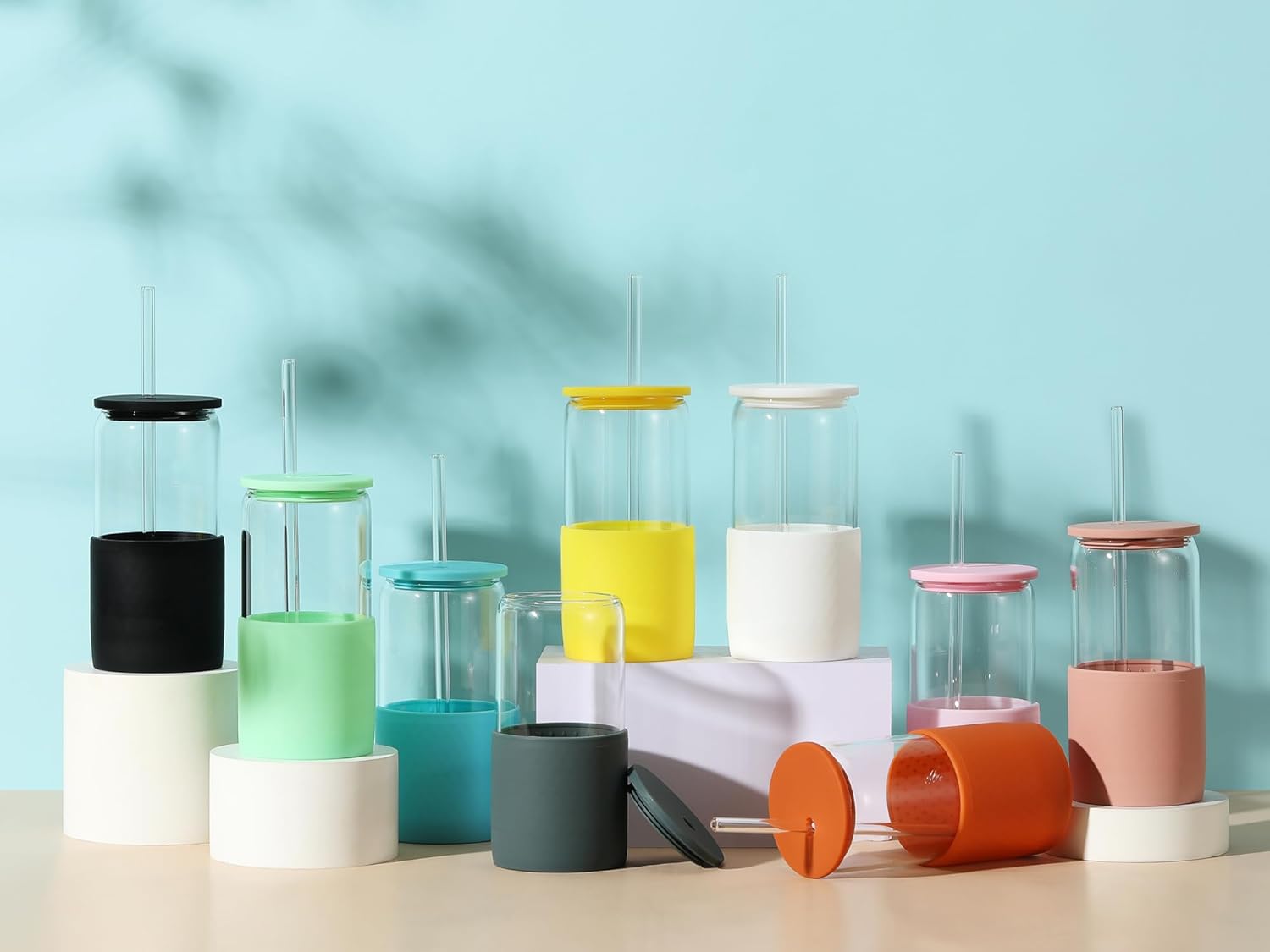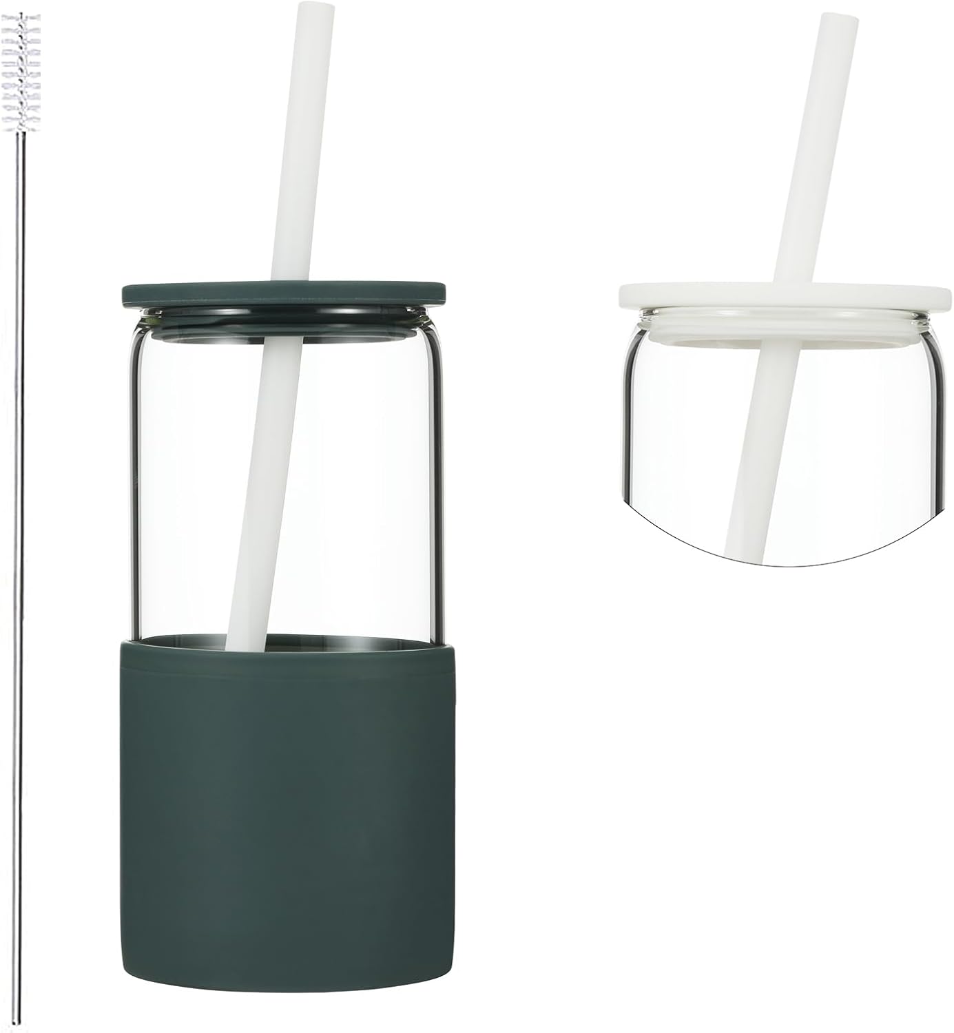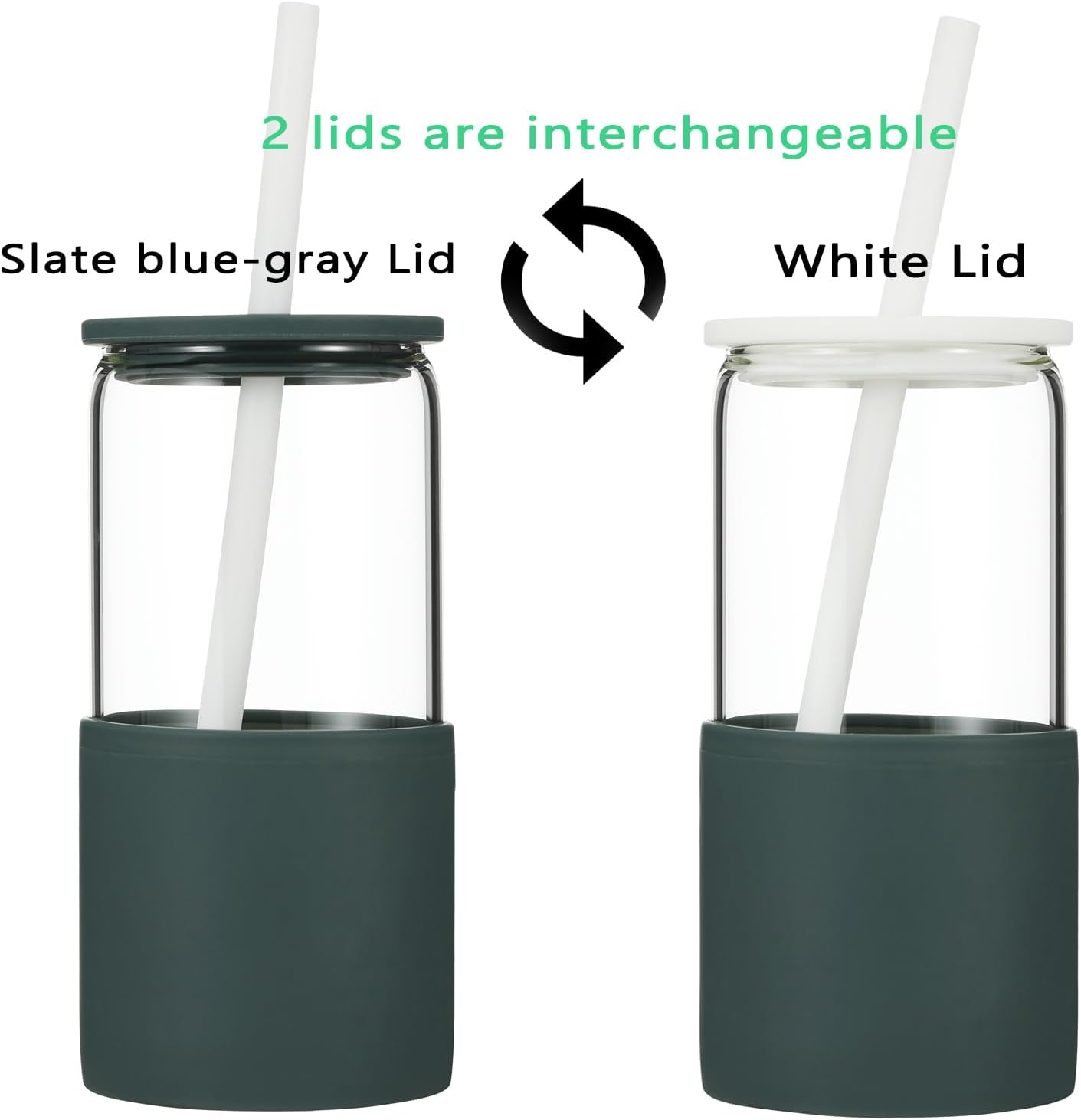 - The two colored silicone lids are interchangeable. This set contains one borosilicate glass cup, one slate blue-gray silicone sleeve, one white silicone lid, one slate blue-gray silicone lid, two white silicone straws, one straw cleaner brush.