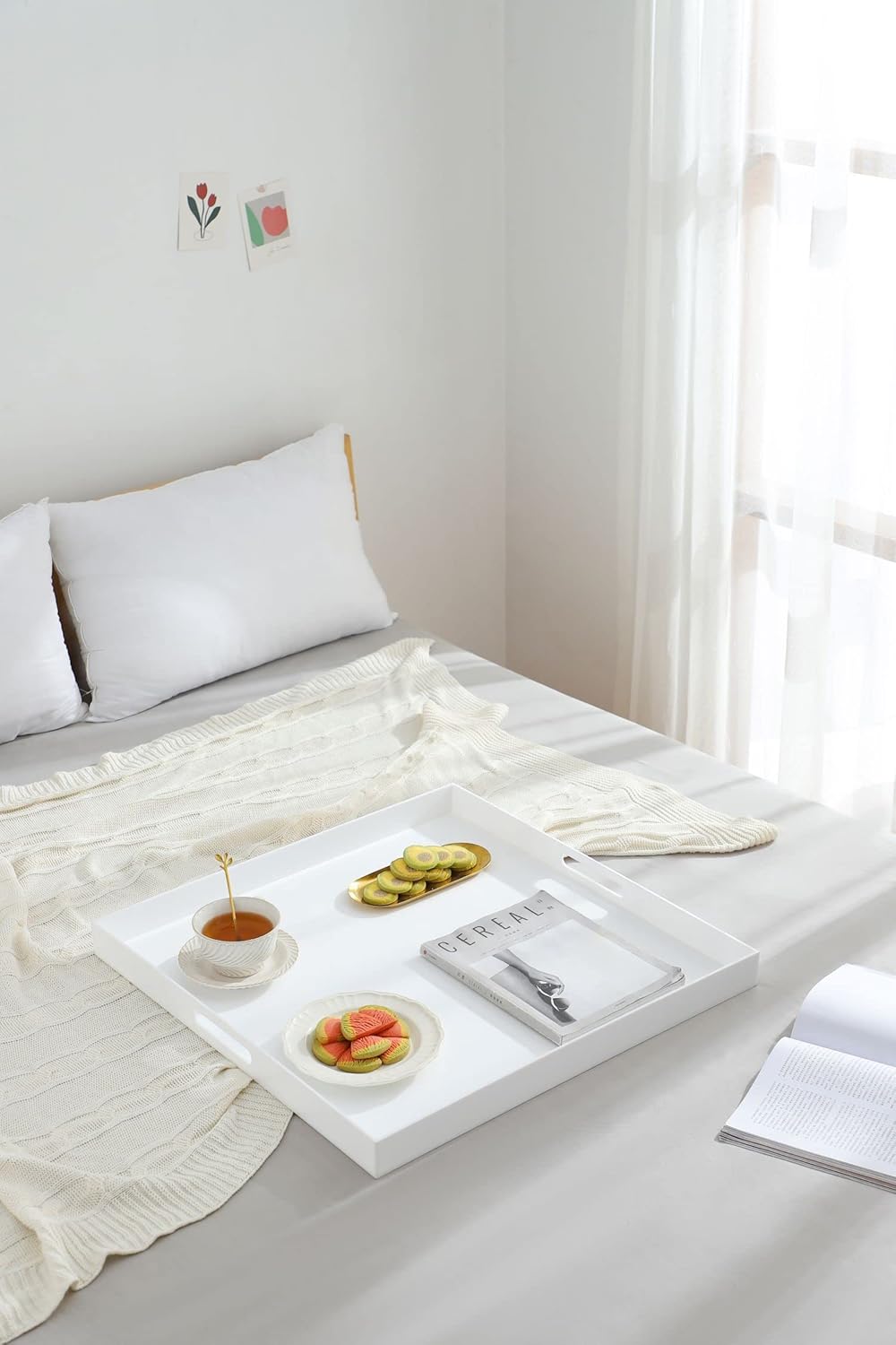 - MULTI-PURPOSE: This Clear Acrylic Serving Tray is a multi-purpose necessity for any home and an ideal decorative companion for your ottoman and coffee table. With handles on the side,the tray is easier for serving meals,snacks,offee,drinks,desserts,serving breakfast in bed, arranging toiletries and cosmetics on a bathroom vanity, storing remote controls in the living room, and turning your sofa into a cozy workstation.