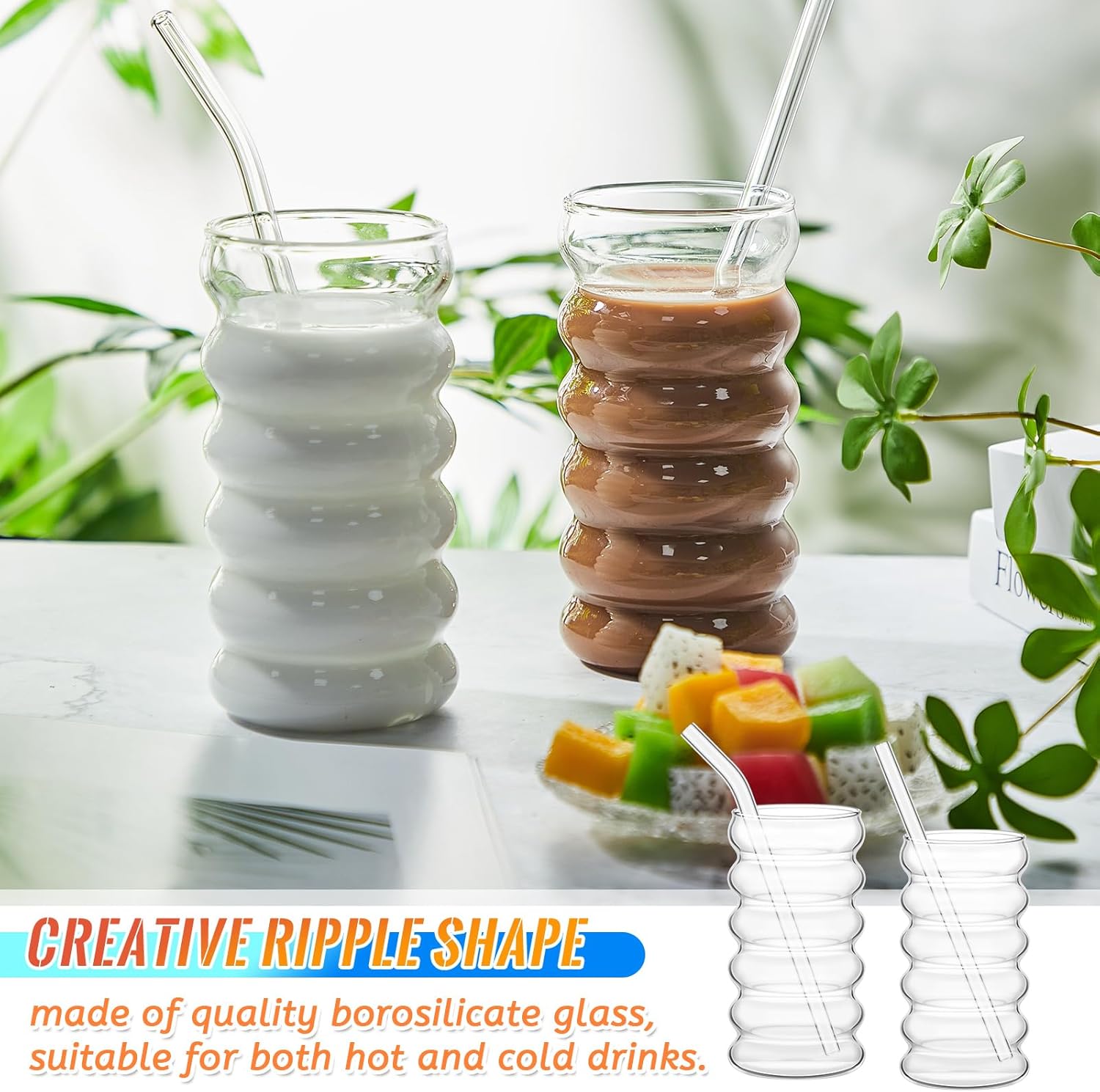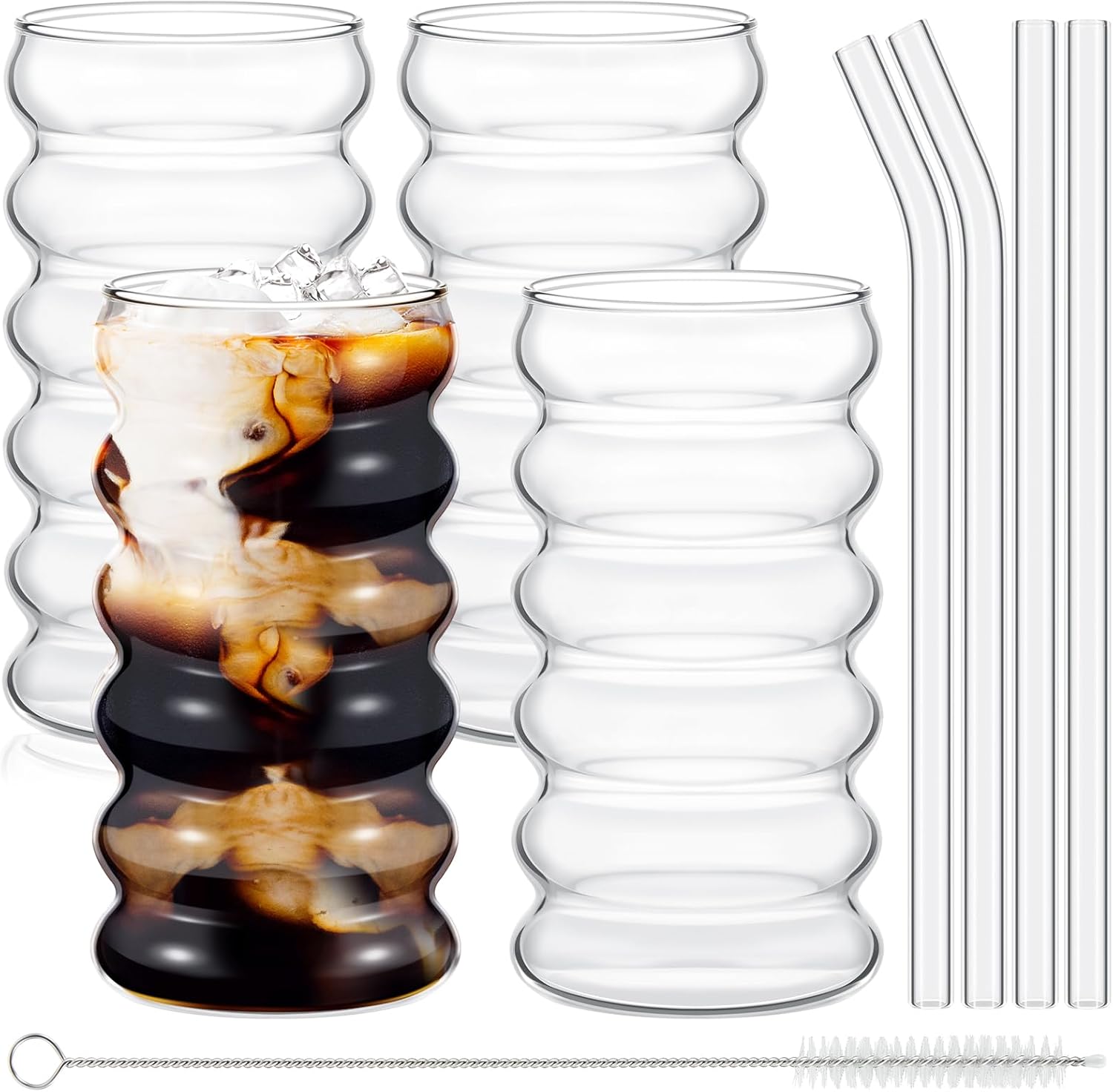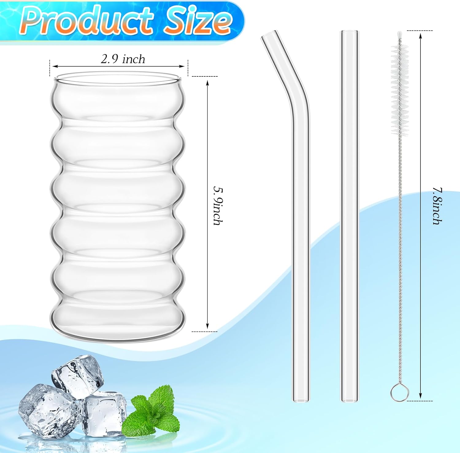 Tessco for you 4 Pcs Creative Glass Cups Vintage Drinking Glasses Ribbed Glassware Aesthetic Cup Entertainment Dinnerware Glassware with Straws Set for Kitchen Coffee Beverage(16 oz,Clear)