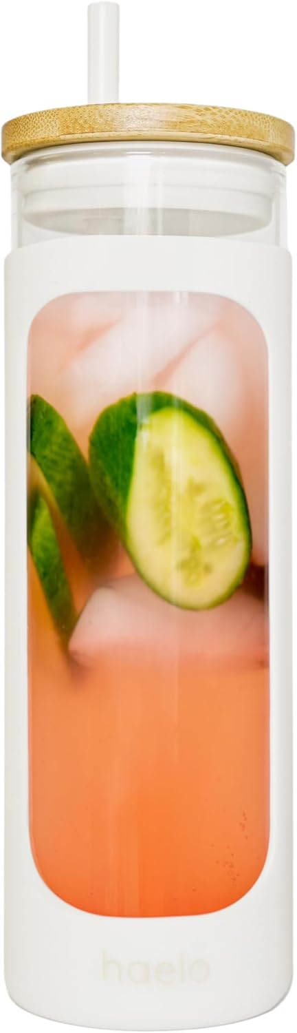 haelo 20oz Glass Tumbler Water Bottle, Iced Coffee Cup with Straw, Silicone Protective Sleeve, Bamboo Lid Reusable BPA Free (White)