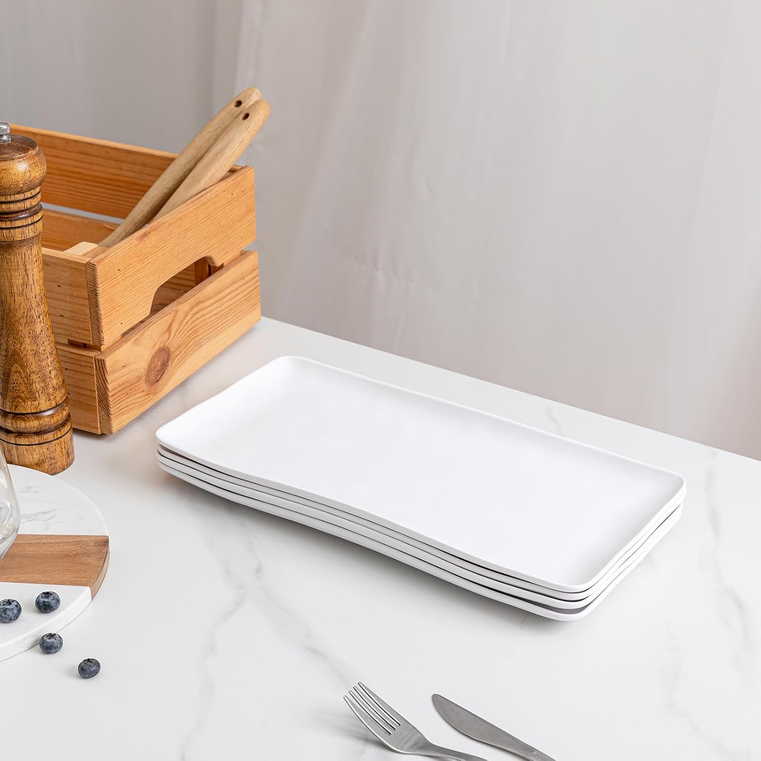 - MELAMINE PLATTER RECTANGULAR TRAY: Stylish design with slightly wavy edges adds a sophisticated look, the raised edges keep your food secure during movement and goes well with our dinnerware set