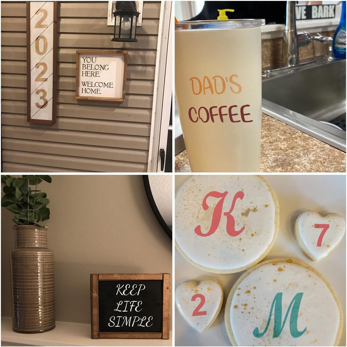 - ☆ EASY TO USE: These stencils can save you a lot of time when decorating cookies or creating crafts, you can customize words and numbers to create any art projects you want. You just put them on the surface of the object, paint with a brush or spray with a spray gun, simply do it! They are reusable, easy to clean with soap and water. The reasonable size is easy to store. Size: stencil 6.3"x 5.5", letter height: letter about 1"and 0.5", number about 1" and 0.5".
