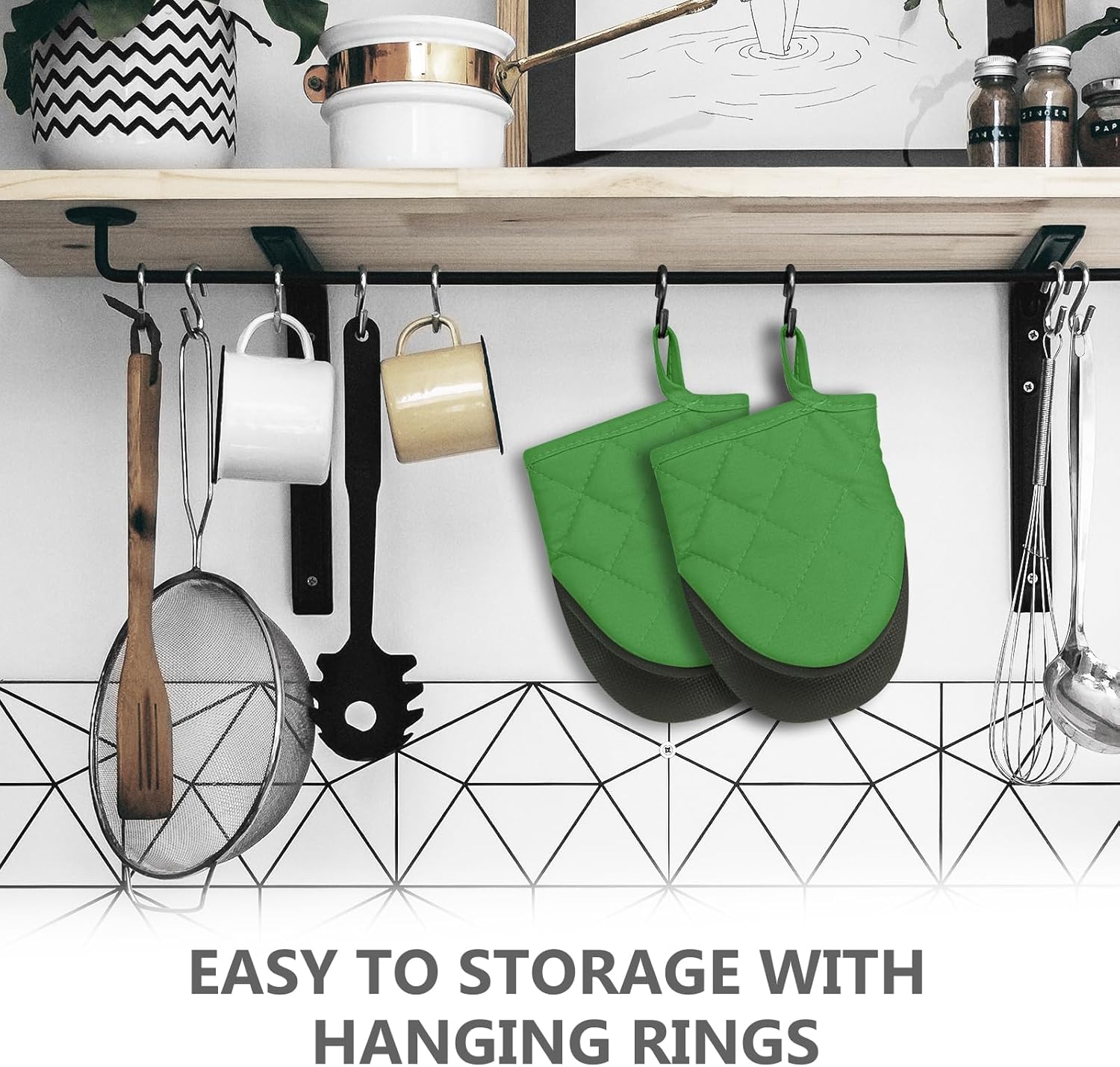 1 Pair Short Oven Mitts - Silicone Kitchen Oven Gloves High Heat Resistant 500℉, Mini Oven Mits with Non-Slip Grip Surfaces and Hanging Loop for BBQ, Baking, Cooking and Grilling (Green)