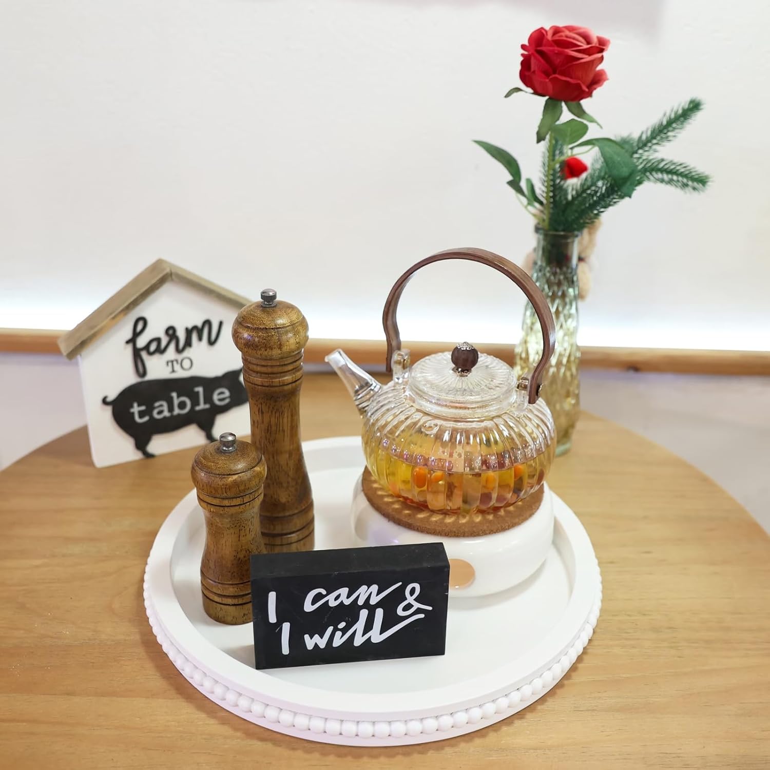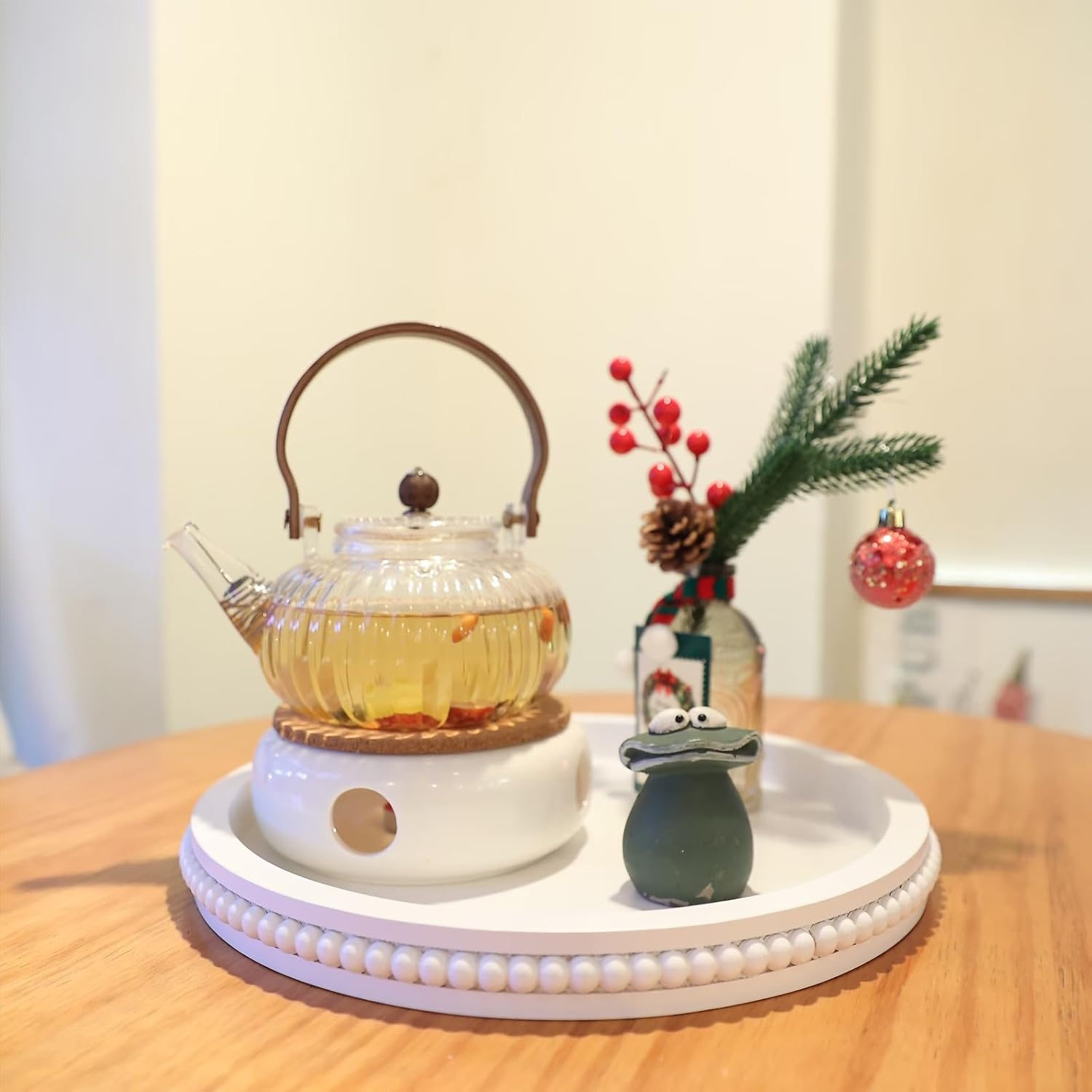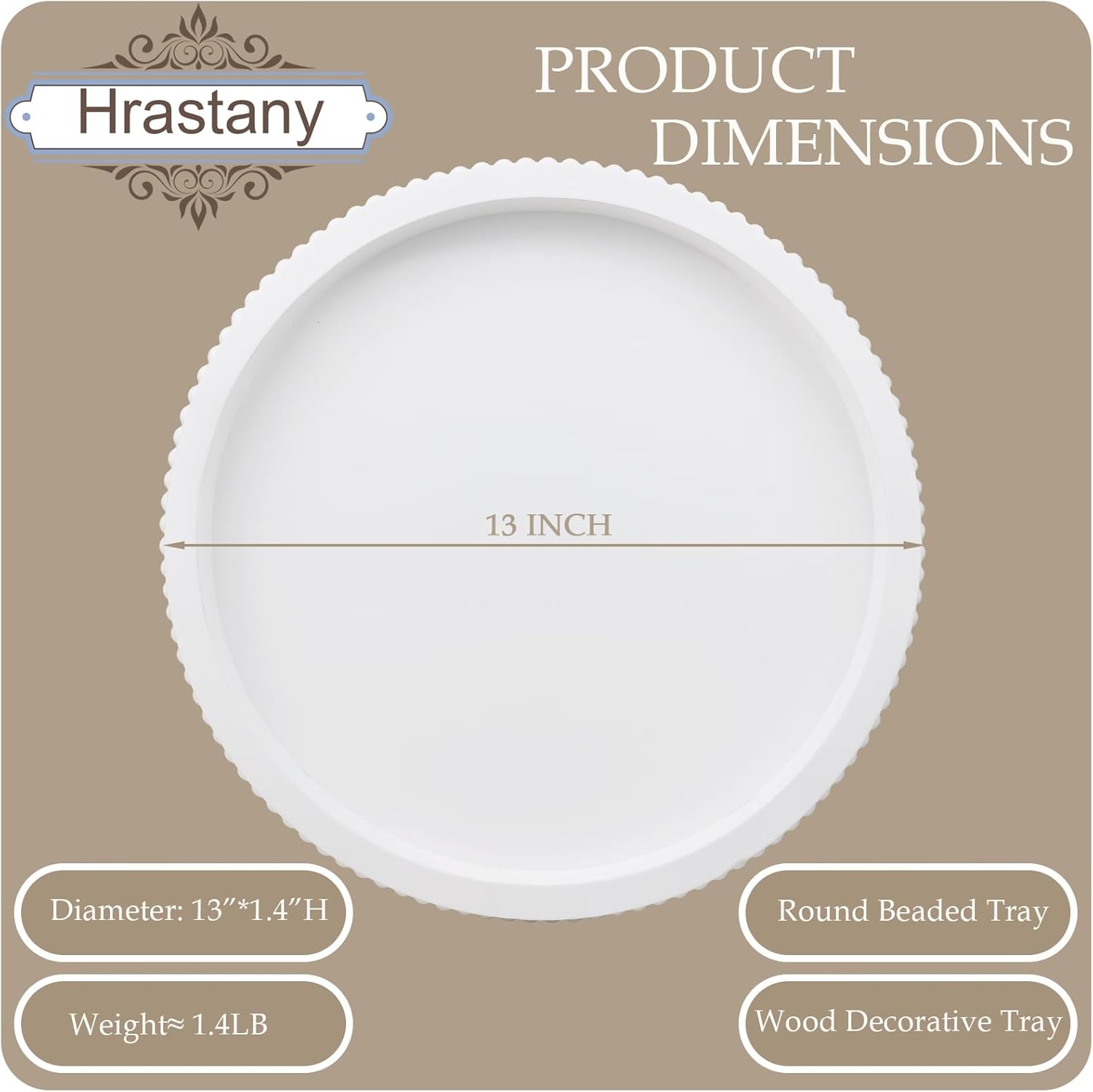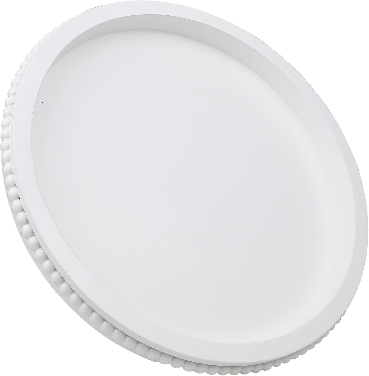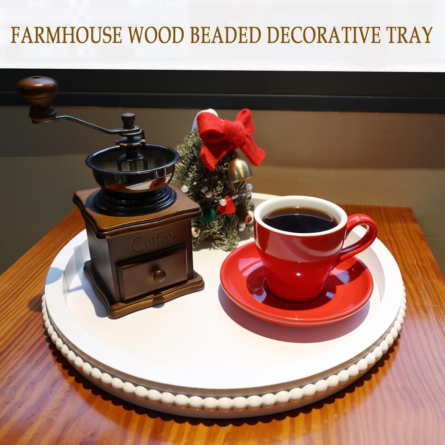Round Wood Serving Tray with Beaded, 13” Rustic Wooden Decorative Coffee Table Tray for Centerpiece, Ottoman, Farmhouse Circle Trays for Counter, Living Room, Home Decor (White)