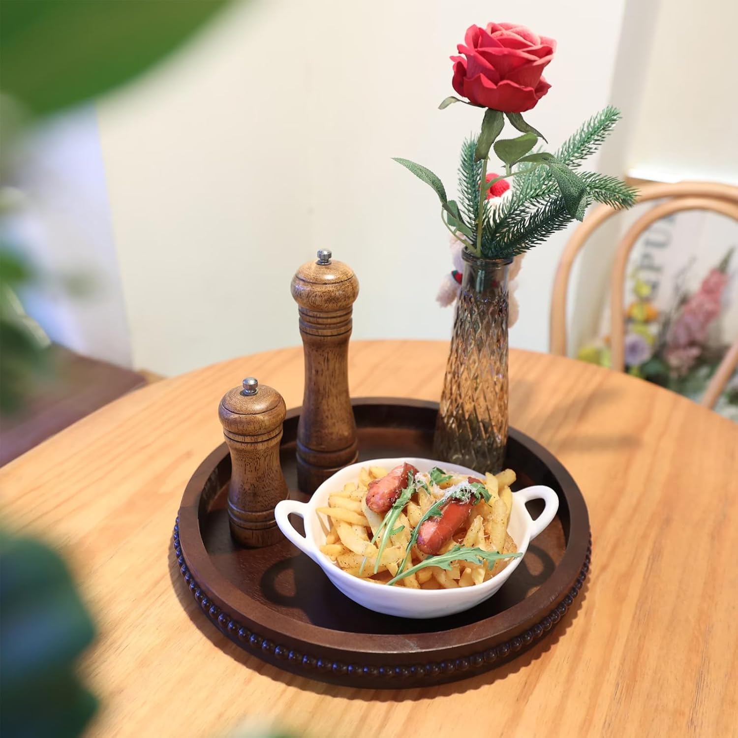 Wood Decorative Serving Tray with Bead, Round Vintage Wooden Ottoman Tray for Home Centerpiece, Counter Organizer, 13” Circle Tray for Kitchen, Living Room (Dark Brown)