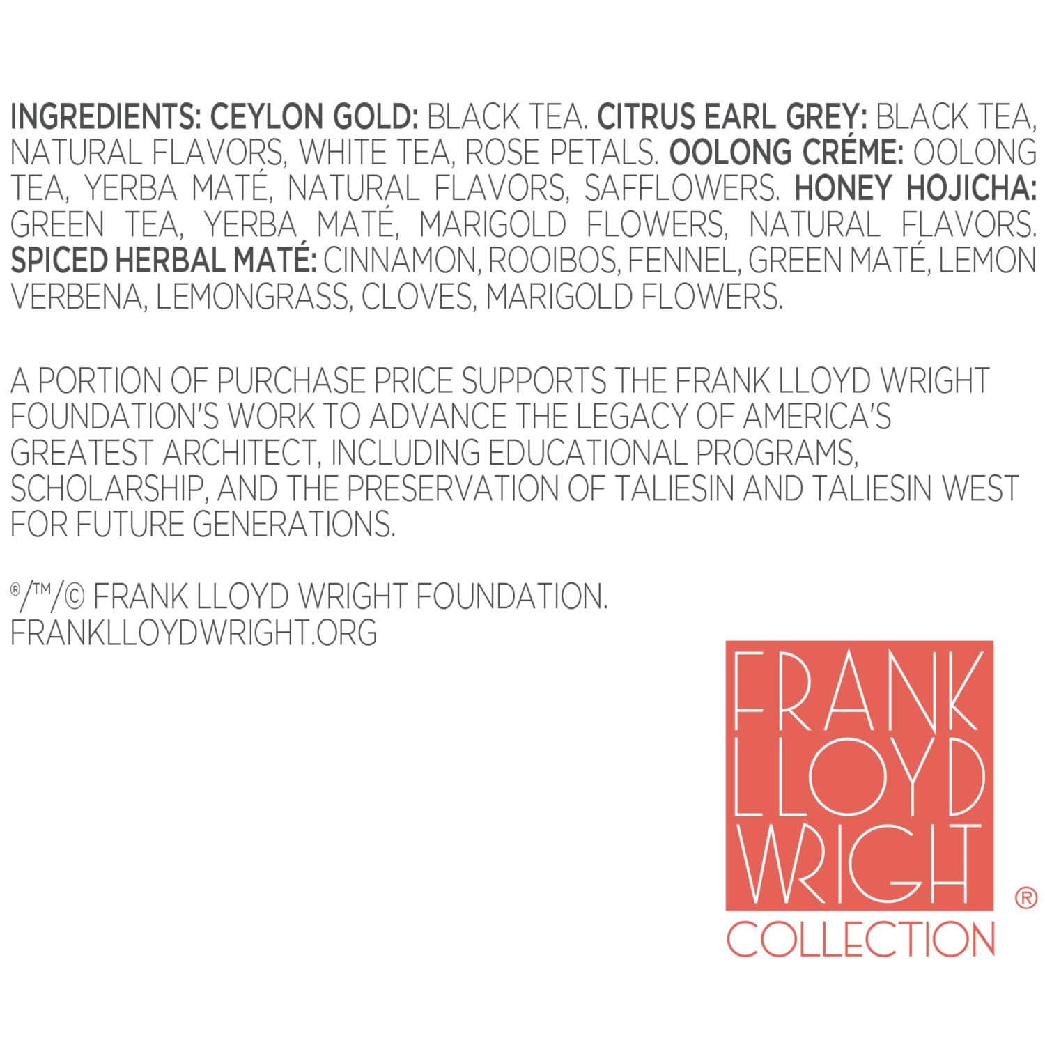 - GROUNDING TEAS make up this distinct colleciton and is expertly crafted to pay homage to the iconic architect. From robust classics to spiced warming blends, each tea evokes a connection to nature, beauty, and tradition.