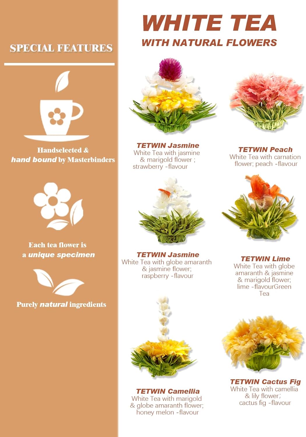 - INCLUDING SIX BLOOMING FLOWER TEA: TETWIN teapot set includes SIX handmade flower tea balls. TETWIN blooming flower teas are picked in the freshest blossom moment in the morning. Natural flowering tea looks appealing as it tastes, free of sugar, no artificial colors and no artificial flavors. Each flowering bouquet is hand tied by skilled tea craftsmen and sealed in airtight pouches to protect its freshness.
