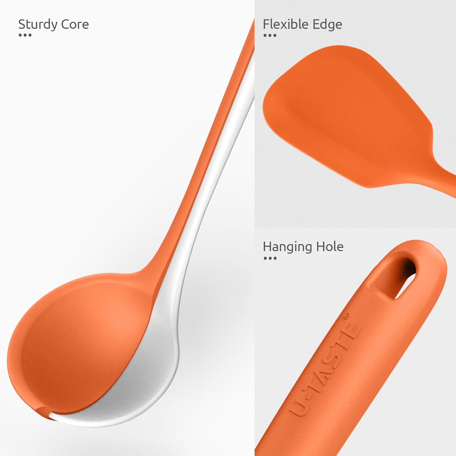 - [Perfect Balance of Flexibility & Stiffness] U-Taste kitchen silicone cooking gadgets set has a strong inner core, providing plenty of serving or turning strength but no piercing issues. Firm enough to not bend or break when you cooking something heavy ingredients. The head of these dishwasher safe kitchen accessories still has flexible edges to scrape the sides (ladle and spoon), to slide and flip the food (turner). The non-slip handle provides sure grip for better control when cooking.