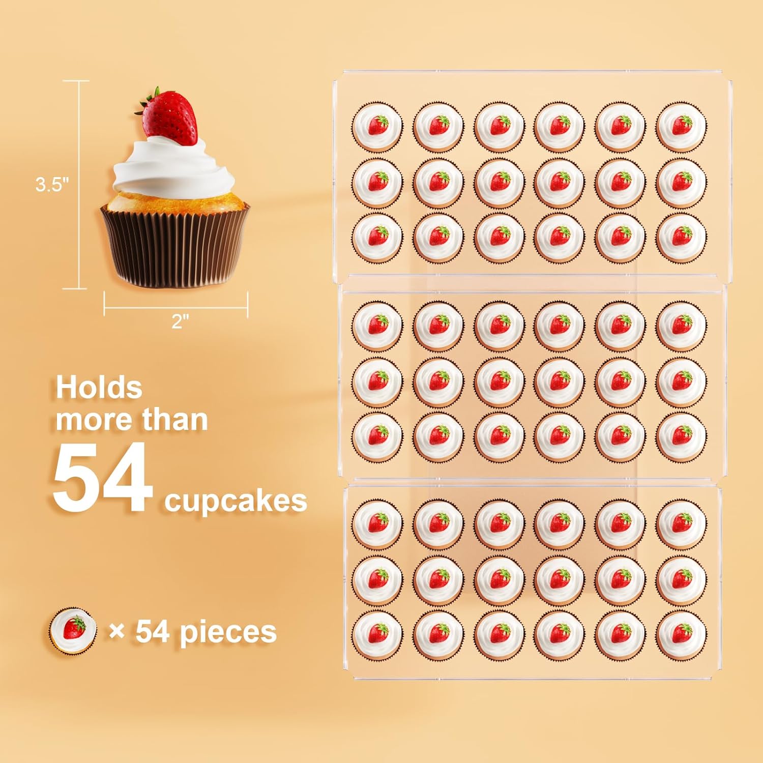- [Impress Details] With a thickness of 0.12 inches, the clear acrylic material boasts remarkable strength and durability. The smooth edges eliminate any worries of scratching, while the open end facilitates effortless cleaning. Notably, 3 sets of our large cupcake display can gracefully hold up to 54 cupcakes, each with a diameter of 2 inches.