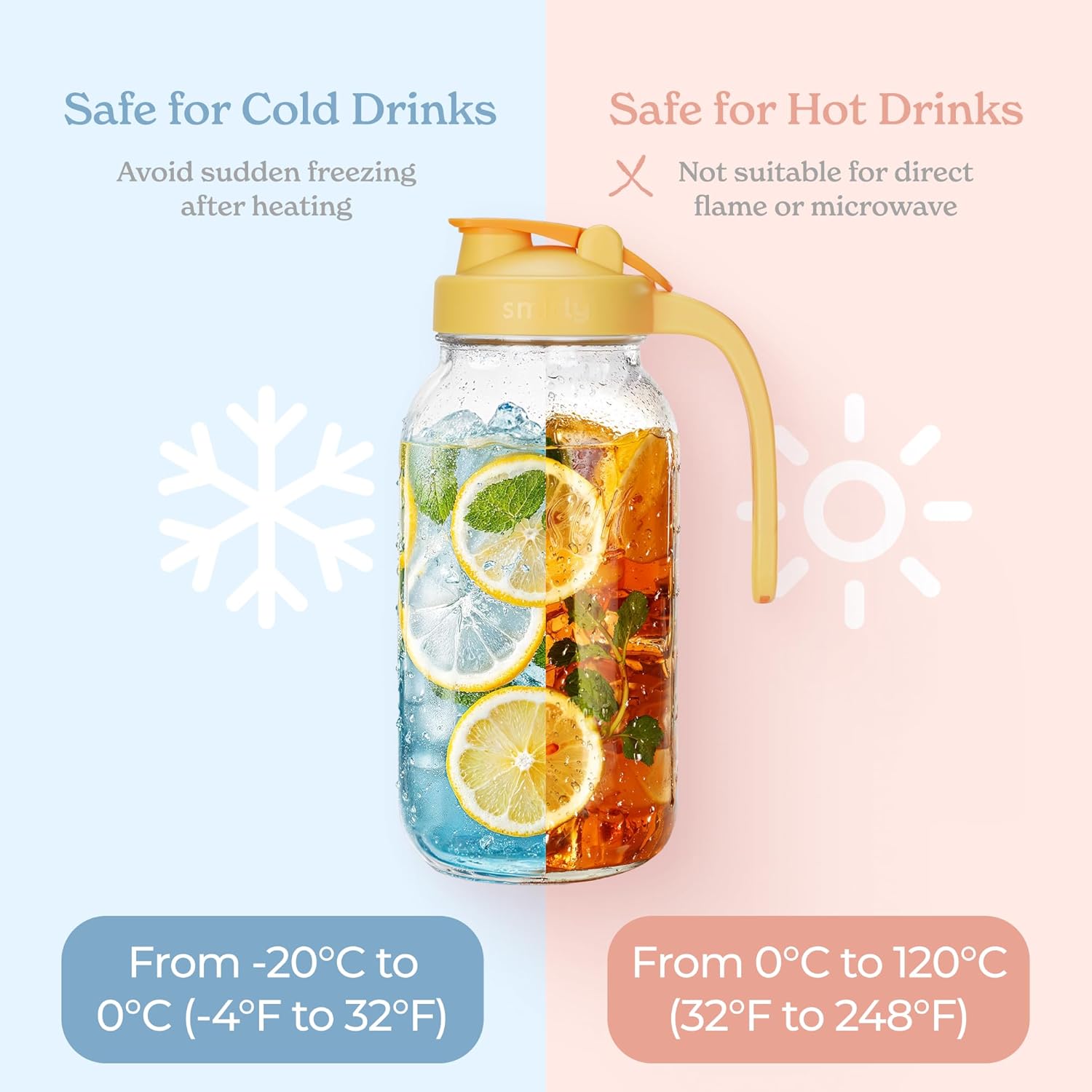 - Heavy Duty: Crafted from thick soda lime glass, this mason jars with lids can withstand temperatures -4 to 302 °F(-20-175°C). So this 2 qt pitcher with lid is perfect as ice coffee pitcher or hot sun tea pitcher