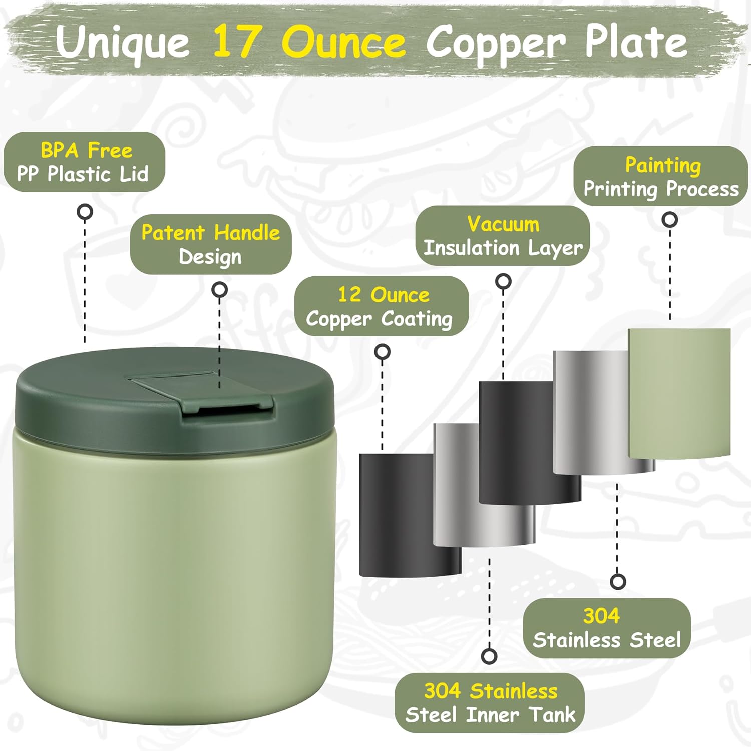 - Keep Food Warm and Cold: Our soup thermo with the insulated 18/8 (SUS304) stainless steel interior with vacuum seal.This will keep your little kids meals warm or cool for 5+ hours. Capacity: 17oz(500ml). Small size and light weight, suitable for home, work or picnic etc.
