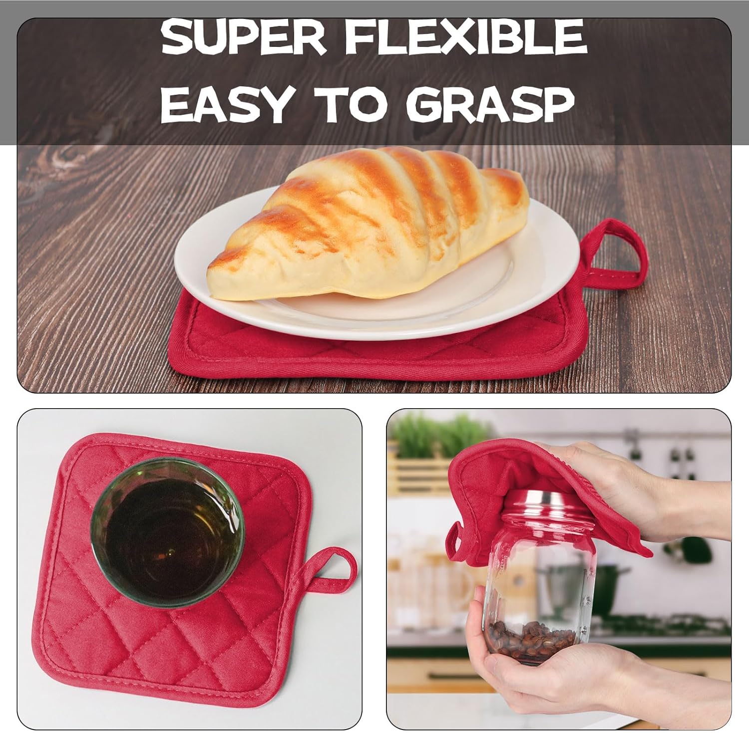 - COMFORT & SOFT COTTON FABRIC: Both oven mitts and potholders are made of durable neoprene and cotton, has 2-layer, with soft inner. Comfortable to touch, protect your hands from heat, steam and grease. Using in kitchen, stains are inevitable, but you can hand wash them with warm water and soap. Also they are machine washable.