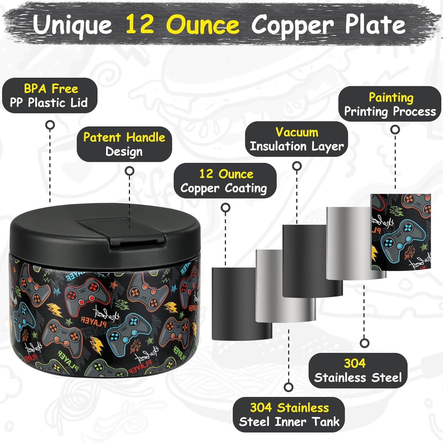 12oz Insulated Vacuum Food Jar with Buckle Lid Wide Mouth Soup Thermo for Hot Food Kids Leakproof Stainless Steel Lunch Container (Black-Game)