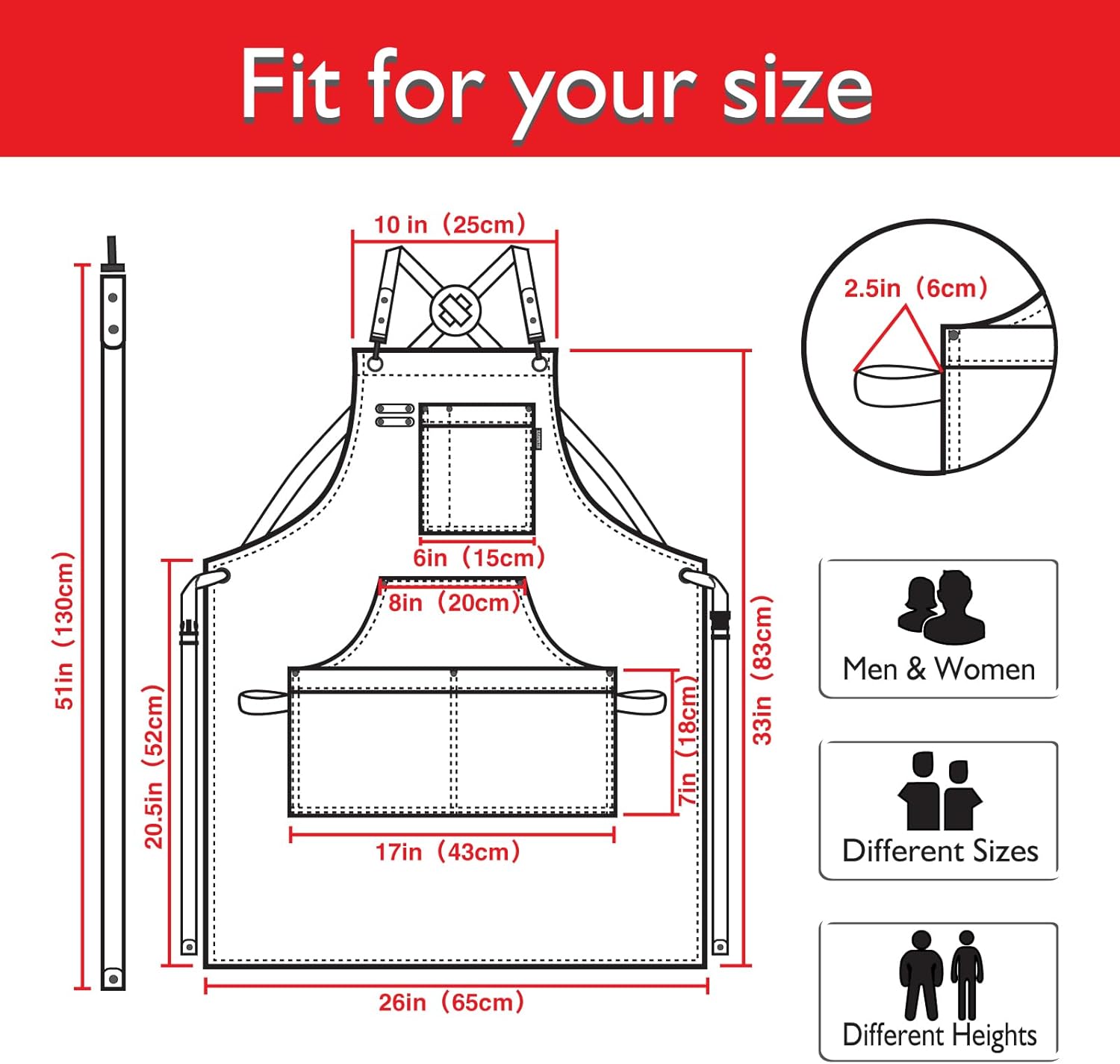 - Universal Size: The apron size is 25.5 inches x 32.5 inches, suitable for full coverage size. The ultra-long, quick-release strap can accommodate multiple sizes, up to men's XXL size (51 inches waist circumference)