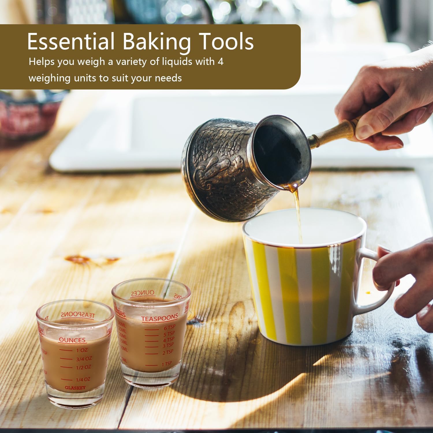 - 【Easy to Measure】 The glass measuring cups set adopts a classic tapered design, with four different measurement methods for you to choose. The maximum scale is 1 ounce (30ml/6tsp/2TBSP). measuring cups glass is easy to measure various liquids or dry materials. It is more convenient than using a measuring spoon. A great tool for kitchen, baking and daily use.