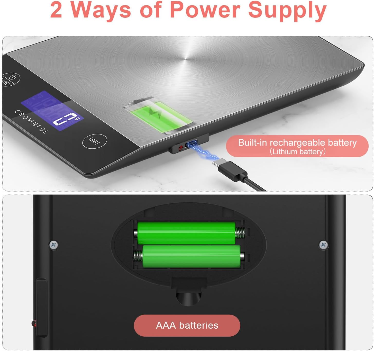 - [Power Supply] The kitchen scale can be powered by either a Type-C charging connector or 2 AAA batteries (USB cable and batteries included).