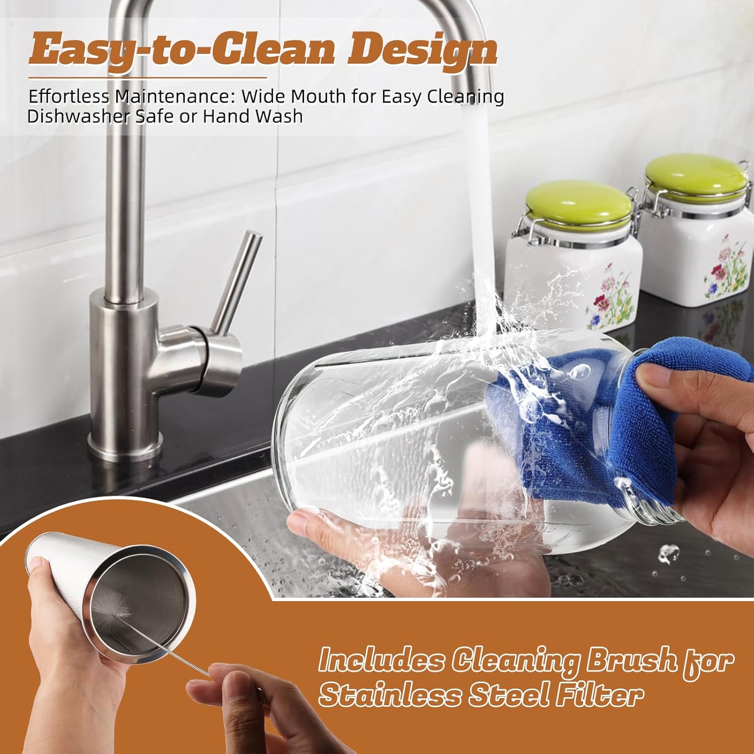 - 【What's Included】: 1 x 64 oz Mason Jar Pitcher with Pour Spout Lid, 1 x Stainless Steel Filter, 1 x 30ml Stainless Steel Measuring Tablespoon, 1 x Cleaning Brush. Enjoy ample capacity for daily use. Please Note: Avoid rapid temperature changes, as this pitcher is not suitable for hot-to-cold transfers.