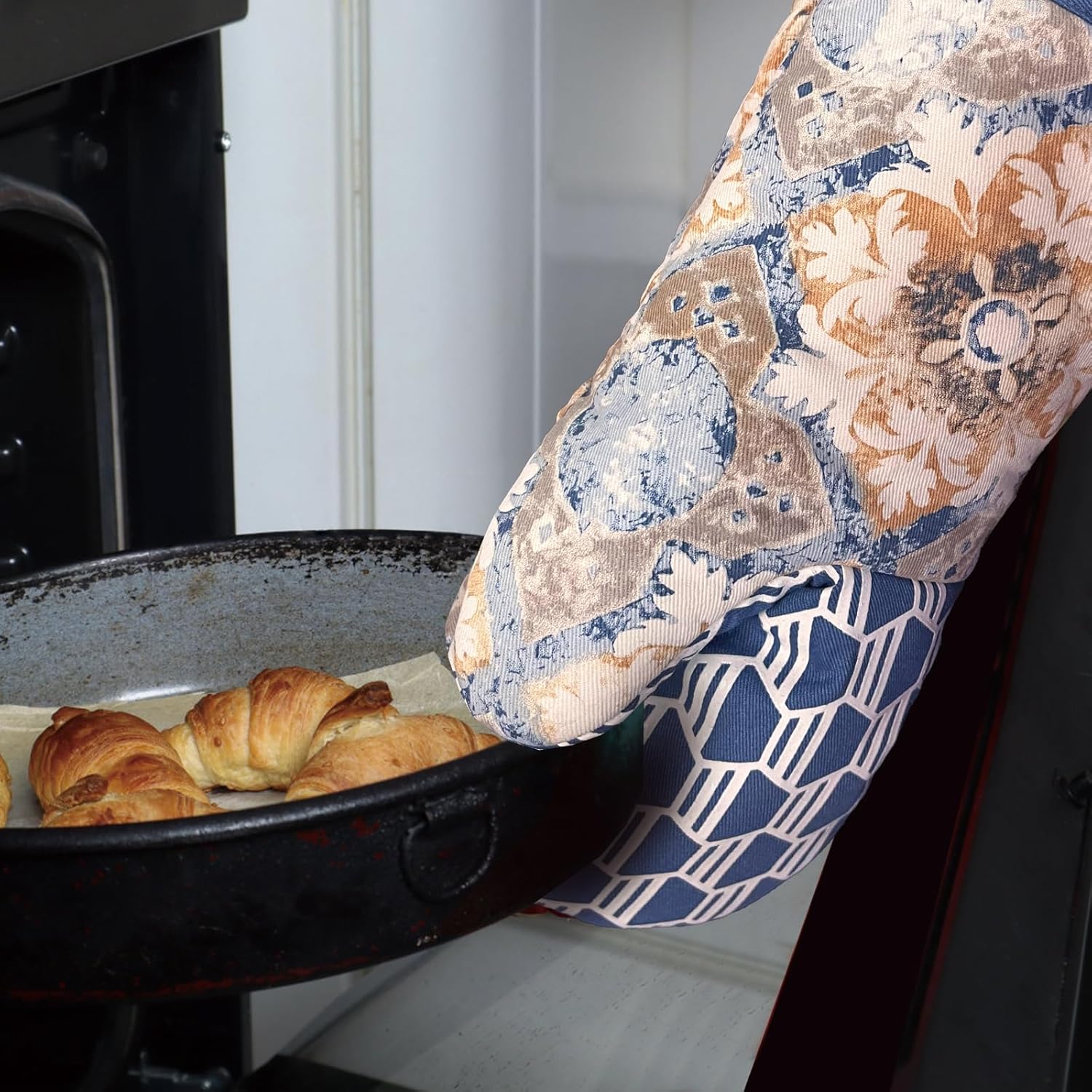 Thumb Oven Mitts, Heat and Slip Resistant Silicone Kitchen Mittens 2-Pack Set, Vintage Carpet Flower Soft Long Oven Gloves, Flexible Potholders for Safe Baking Cooking & Grilling (Dusty Blue)