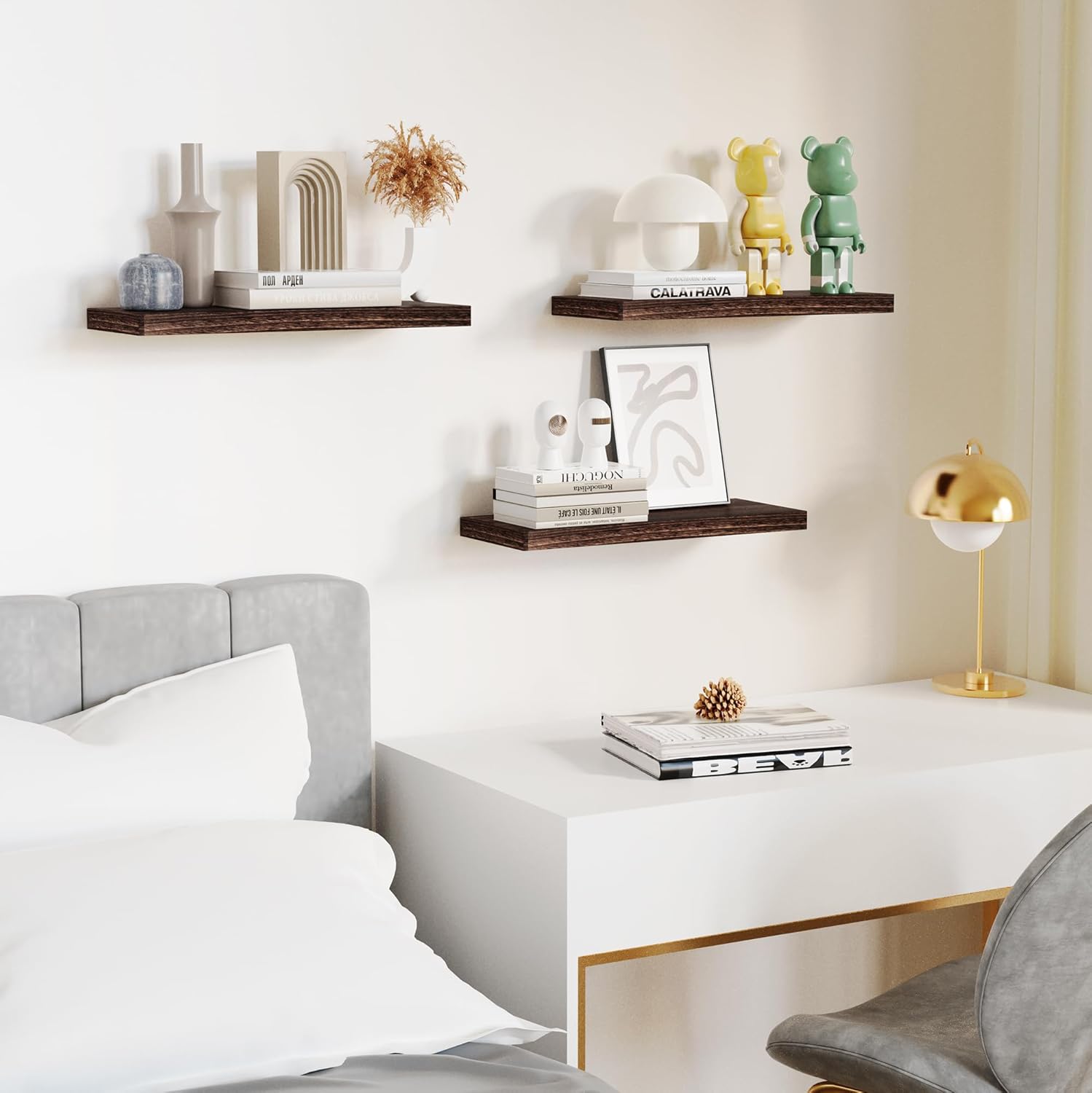 - ăModern Concise DesignăOur white floating shelves are designed with modern simplicity. It has streamlined look to bring modern style and vintage atmosphere to the home. Our wood floating shelves for wall is a set of 3 wall mounted shelves. Our rustic wood shelves can give us plenty of space for creativity, we can choose a line, a ladder shape, or a symmetric way. Let our floating shelf wood more suitable to the home decor and bring a better visual experience.