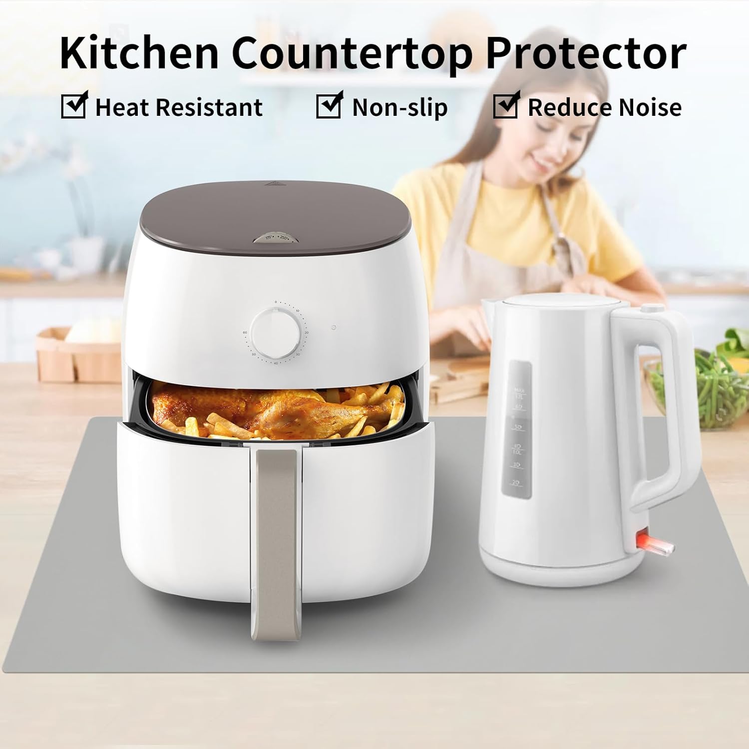 - Extra large silicone mat: Size of 24” x 16”, it can be placed under the air fryer, microwave, toaster oven, induction stove, coffee maker to protect the kitchen countertops and other surfaces against spills, scratches, grease, heat, etc.And it also reduces the noise of the appliance when running.