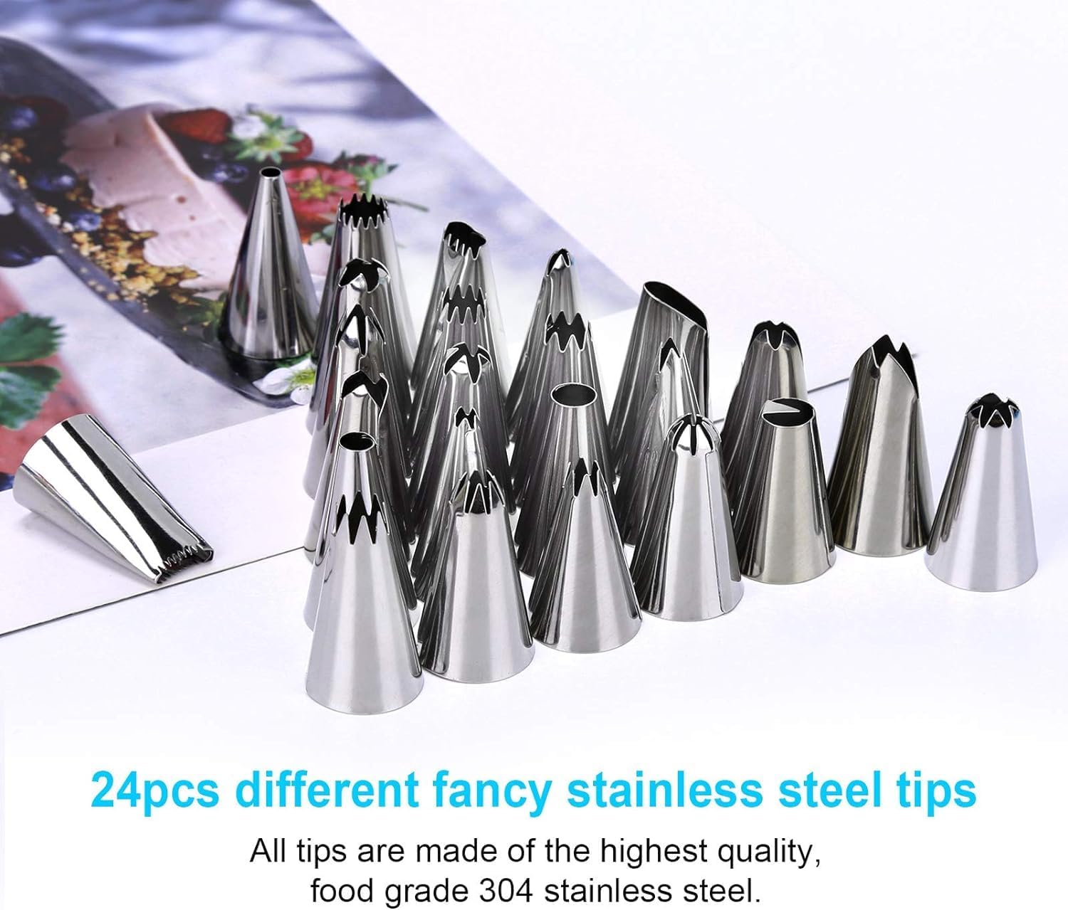- 【Icing Piping Set】Package contains 24 different stainless steel icing tips, 1 reusable piping bag, 10 disposable piping bag, 2 plastic converter, 1 storage box. Prepare our baking supplies have everything you need for frosting beautiful cakes and cupcakes.