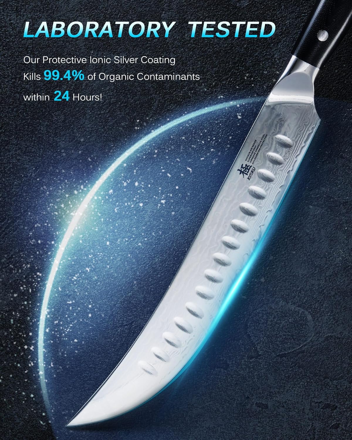 - Razor Sharp Blade: This butcher knife's ultra-sharp blade is precisely honed to 8-12 degrees, making it perfect for slicing hams, roasts, and poultries, while the dimples prevent food from sticking.