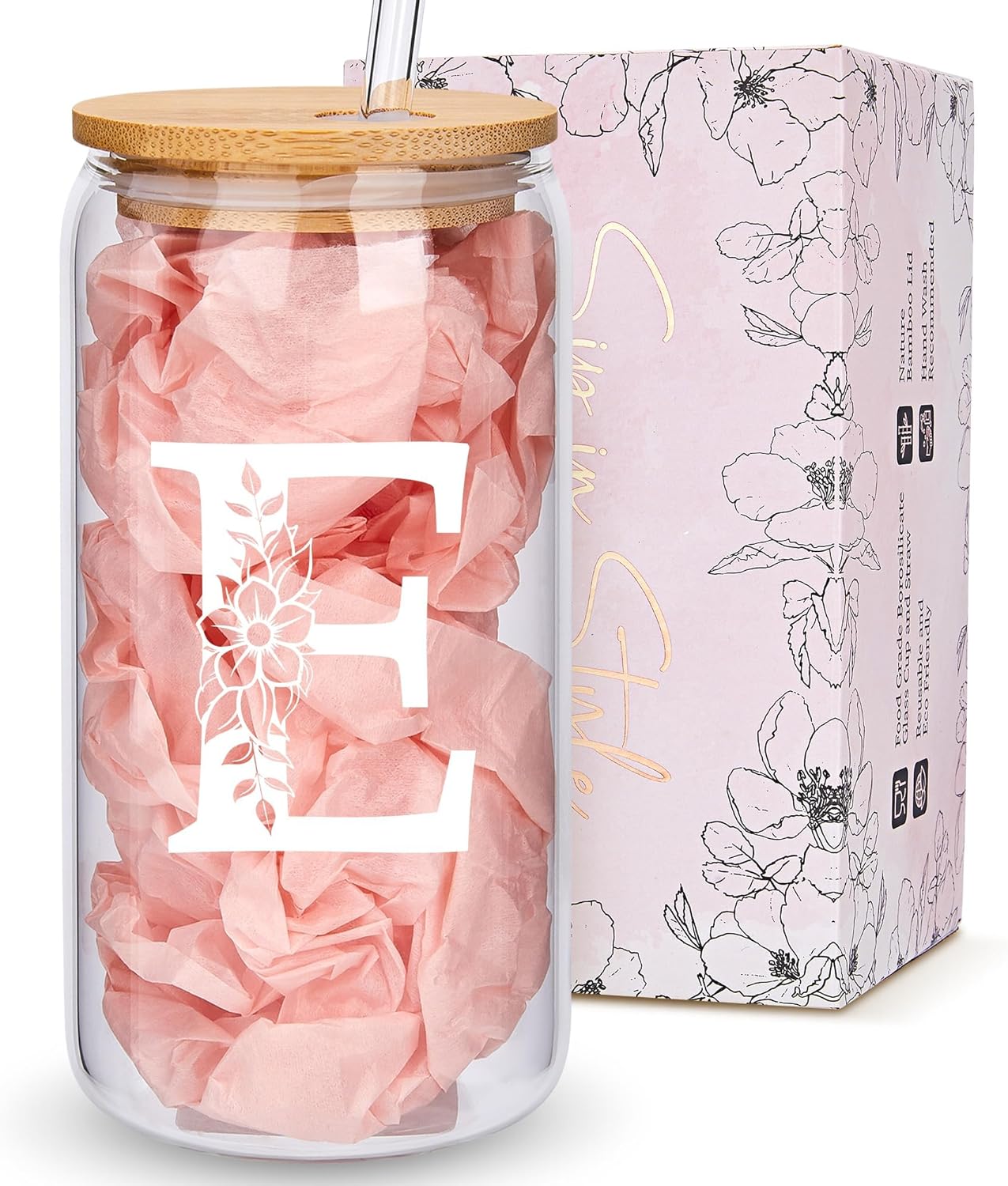 Personalized Gifts for Women, Monogrammed Glass Cups with Lids and Straws, Custom Tumbler, Cute Customized Mug, Aesthetic Stuff, Initial Iced Coffee Cup, Drinking Glasses, Birthday Teacher Gifts, E