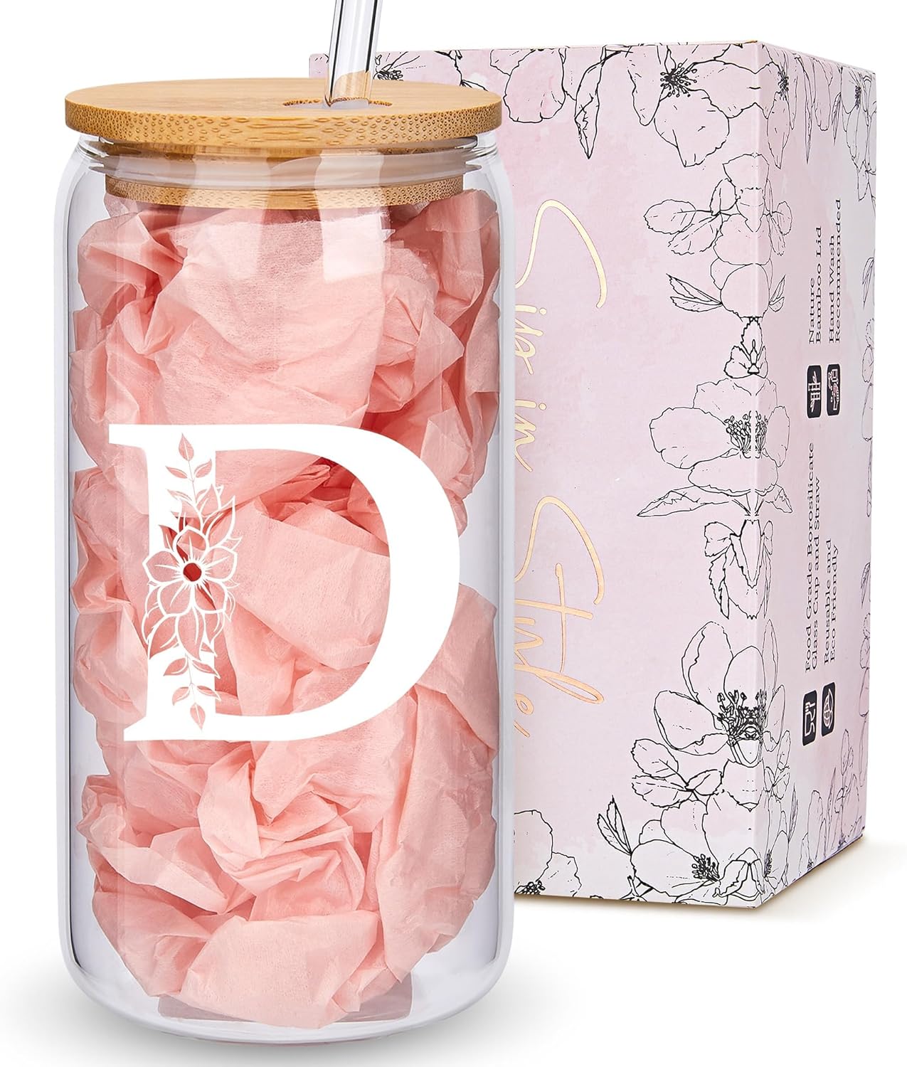 Personalized Gifts for Women, Monogrammed Glass Cups with Lids and Straws, Custom Tumbler, Cute Customized Mug, Aesthetic Stuff, Initial Iced Coffee Cup, Drinking Glasses, Birthday Teacher Gifts, D