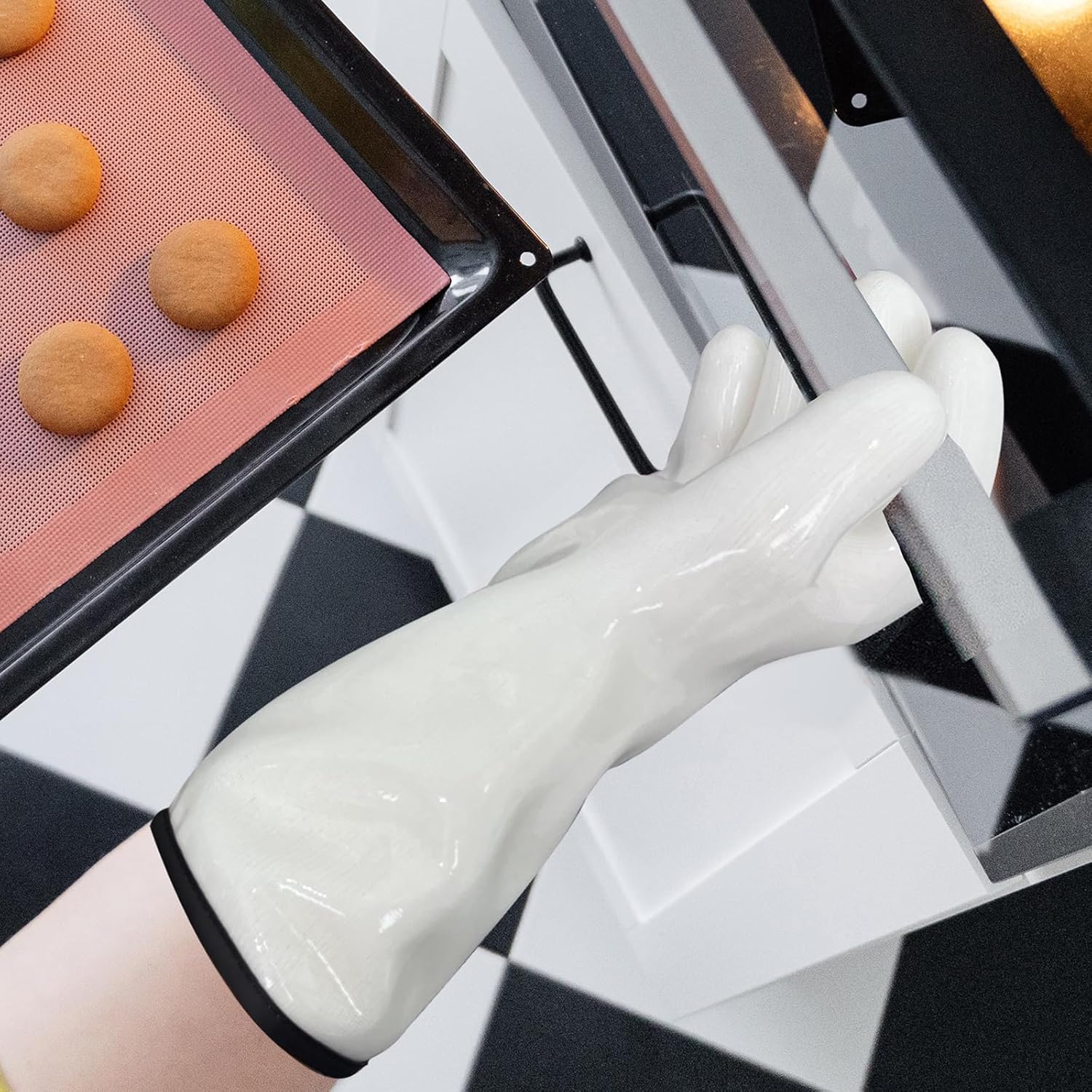 Oven Gloves Liquid Silicone Gloves Food Grade Heat Resistant Mitts with Fingers, for Cooking Baking Grilling Waterproof, with Nylon Liner, White, Large