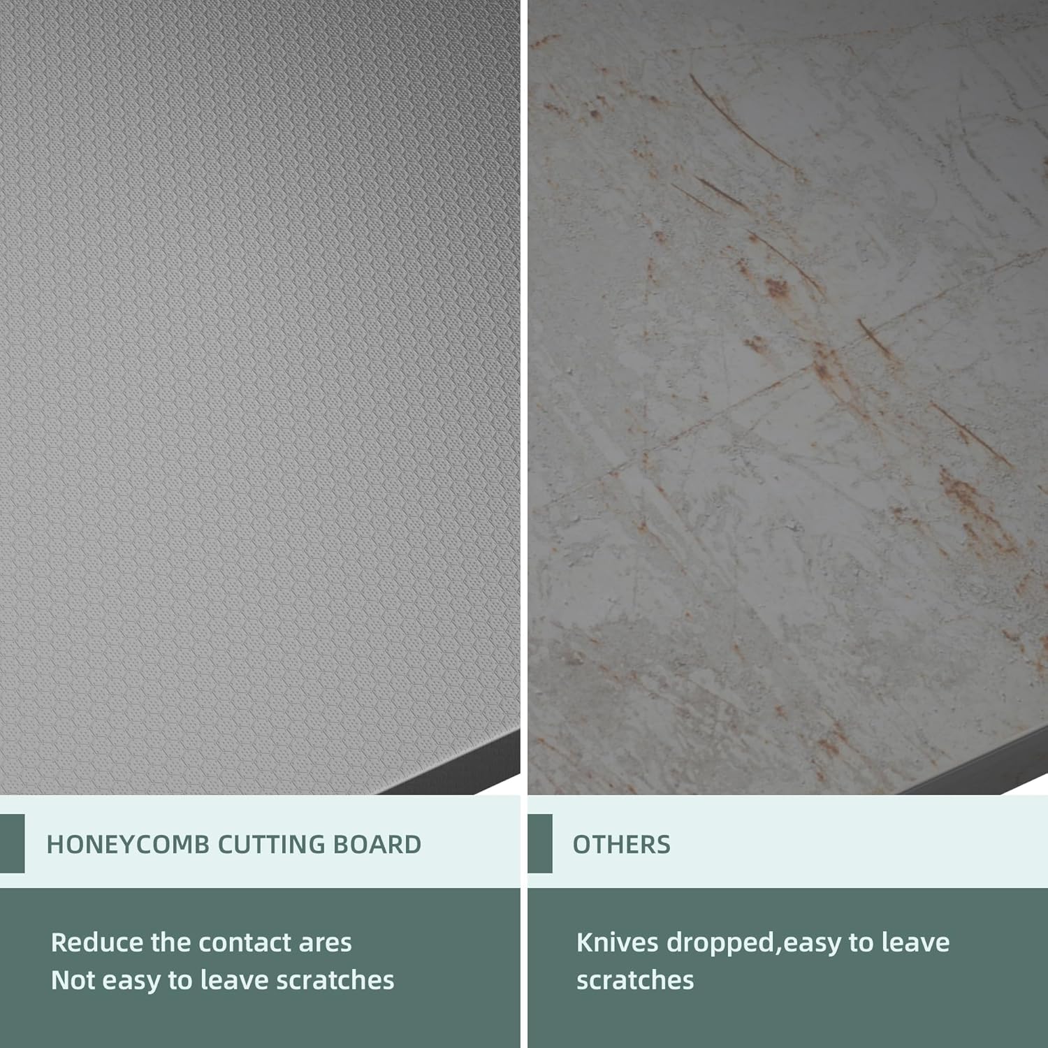 - Special Technology:The cutting board is made of a special hexagonal honeycomb process. This material is more non-slip, scratch-resistant and harder than ordinary stainless steel. It will not bend during use and will not damage the knife. It is more durable than other cutting boards