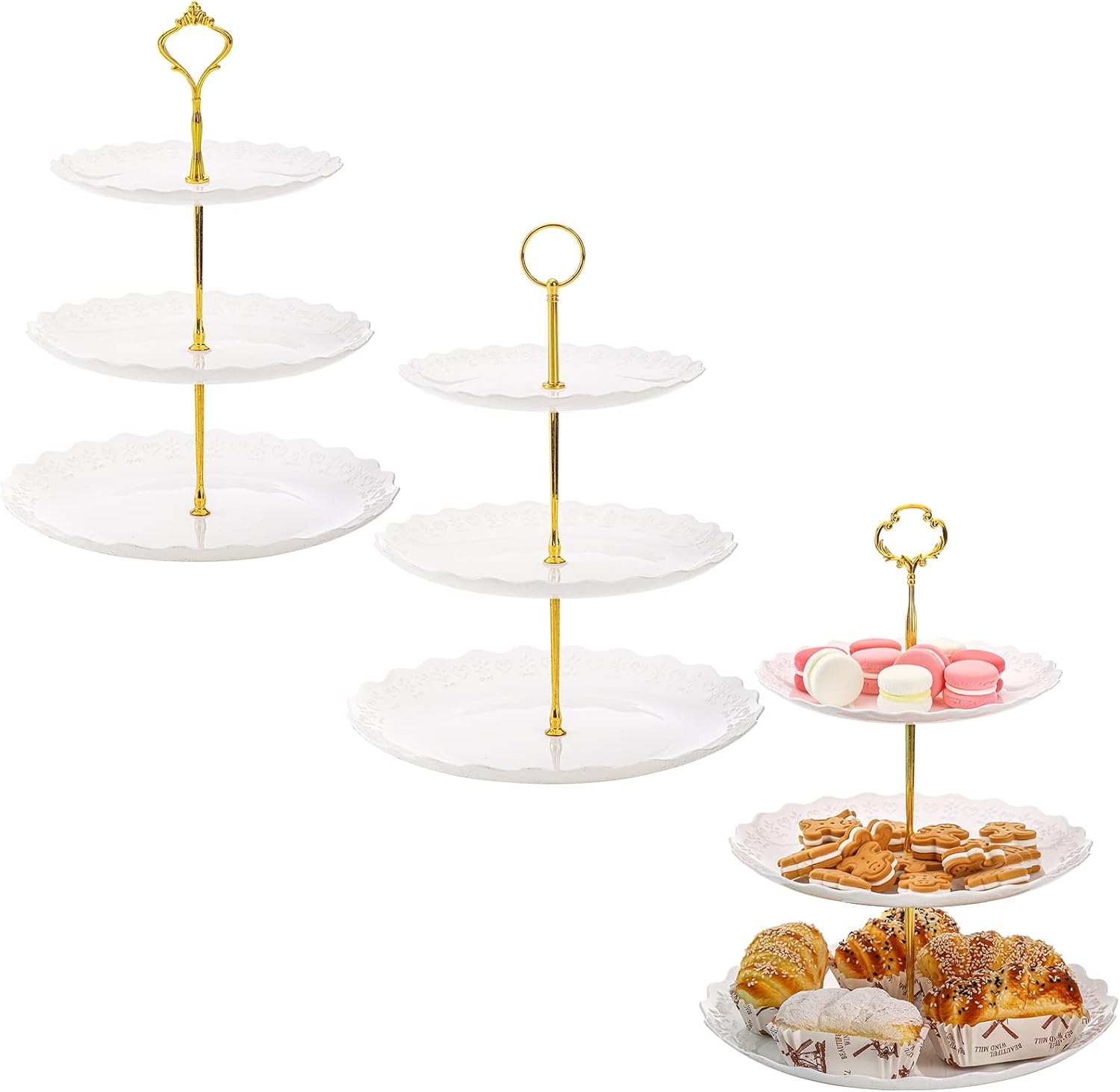 Tosnail 3-Pack 3-Tiers White Plastic Cupcake Stand, Dessert Serving Trays, Party Serving Tray Fruit Pastry Holders Catering Tray for Wedding, Party, Gathering - Round with Gold Rod