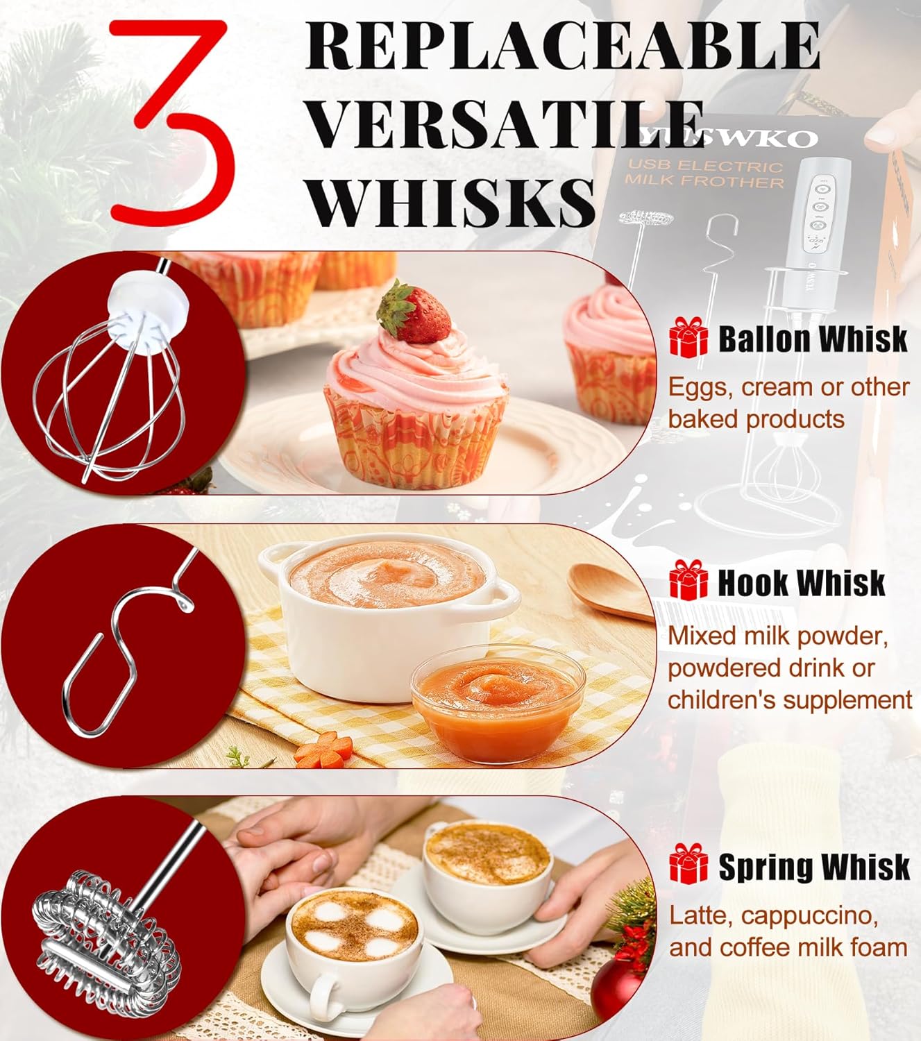 YUSWKO Rechargeable Milk Frother for Coffee, Handheld Drink Mixer with 3 Heads 3 Speeds, Ideal Electric Stirrers for Travel