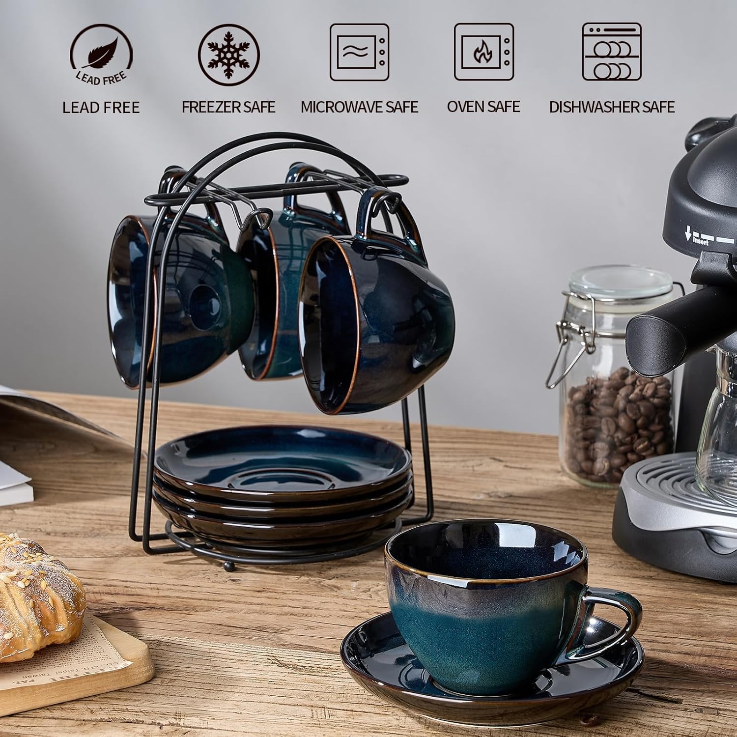 SIDUCAL Espresso Cups Set of 4 [8oz] Porcelain Coffee Cups with Saucers and Holder,Latte Cups- Latte Art Cup - Microwave/Dishwasher Safe,Espresso Demitasse Cups(Blue and Green)