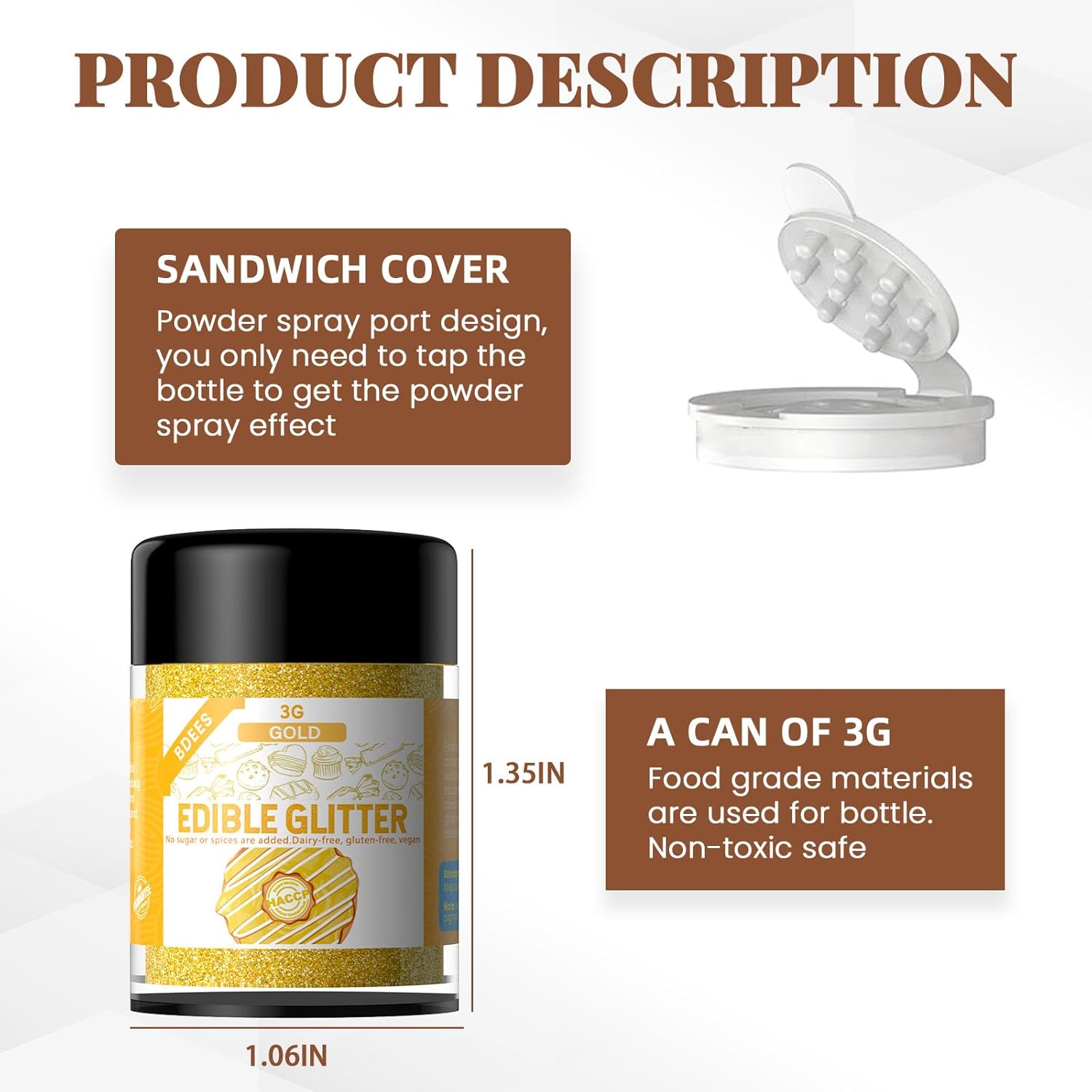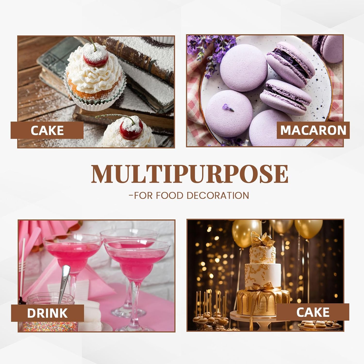 - Convenient Packaging: Each color comes in a 3g bottle, perfect for multiple uses. The food-grade shimmer is easy to apply, ensuring a lustrous finish to your culinary masterpieces.
