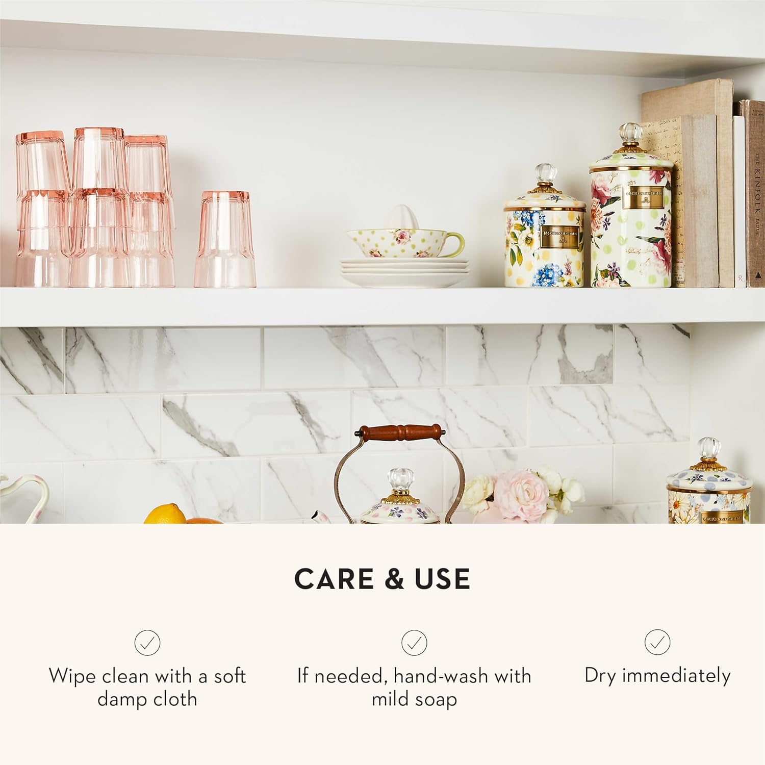 - DECORATIVE STORAGE ESSENTIAL: The Wildflowers Enamel Canister features hand-applied floral transfers on hand-painted colored splots and is topped off with a glass knob. Itโs available in multiple sizes to mix and match in a set for your storage needs!