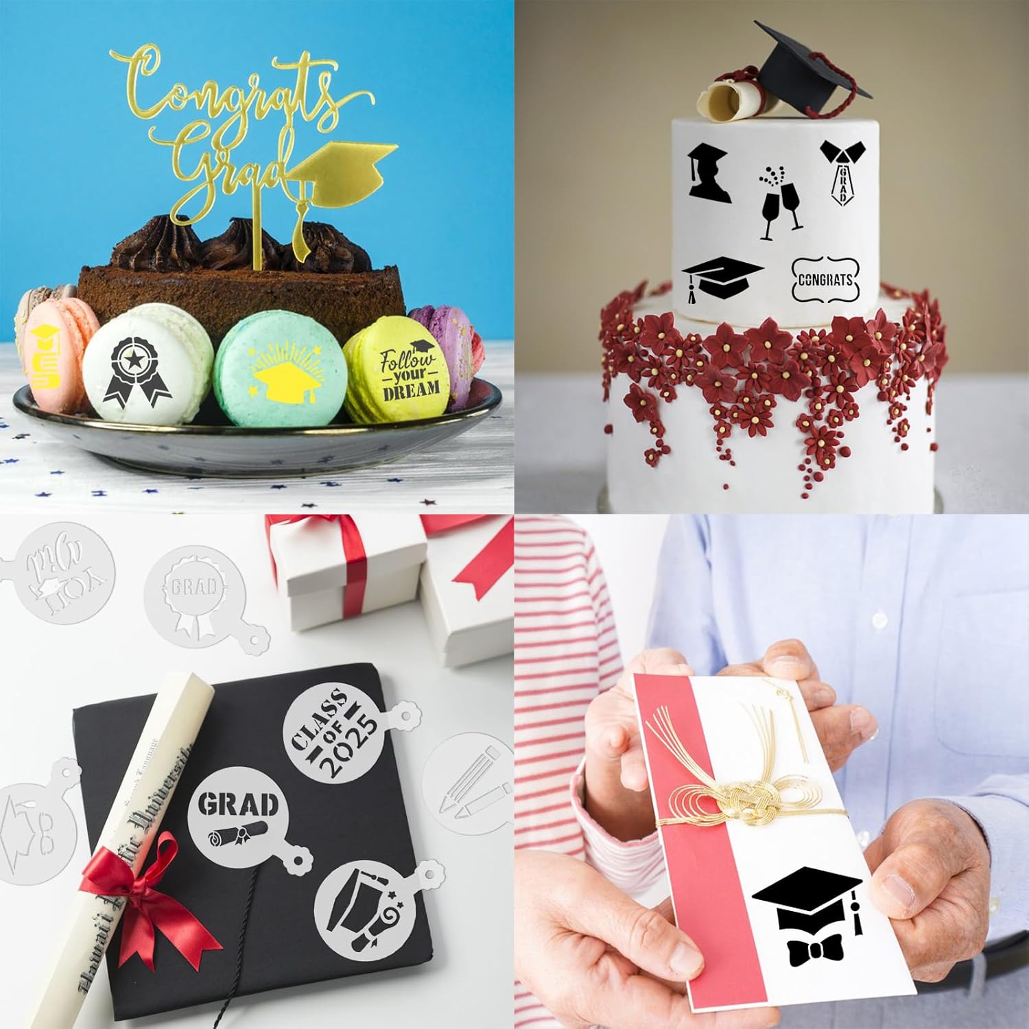 - Wide Application: Graduation cookie stencils are nice for decorating your coffee, cakes, cookies, bread and dessert. Also can be used to craft creating, painting, wrapping paper, gift decorating and different kinds of DIY crafts. Use these coffee stencils to paint on glass, burlap, rock, woods, desserts, greeting cards, scrapbooks, walls, window, albums,notebooks,furniture,canvas,cups, making your life more colorful
