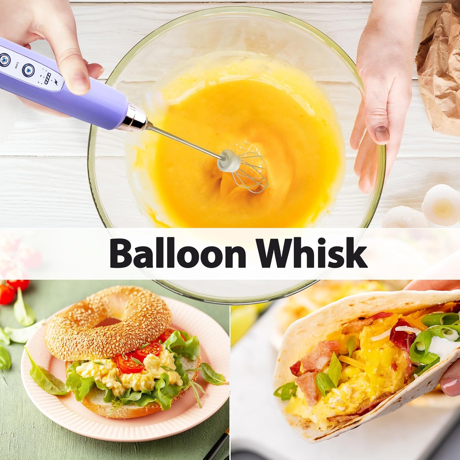 - 3 Whisks and 3 Speed Adjustable Frother : The matcha frother comes with 3 adjustable whisking speeds. SLOW SPEED for stirring egg yolks, powder drinks. MEDIUM SPEED for making jam, matcha tea. HIGH SPEED for milk or coffee froth, fluffy whipped cream, egg whites. Versatile 3 replaceable whisks: SPRING WHISK for creating milk and coffee froth, to make delicious drinks; BALLOON WHISK for mixing egg and whipping cream; HOOK WHISK for blending powders, making jam