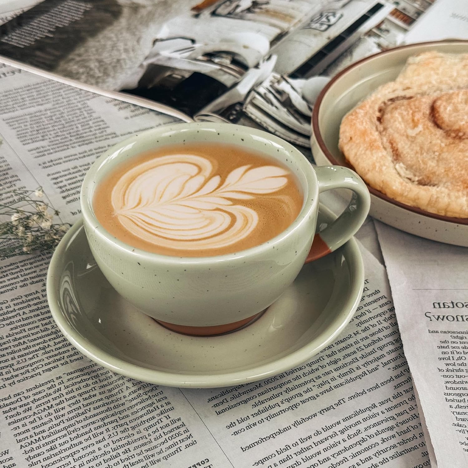 Mora Ceramic Latte Art Mug With Saucer - 10.5 oz, Round Bottom For Perfect Pours - Cafe Cups for Cappuccino, Espresso, Coffee, Tea etc - Porcelain Set for Baristas, Great Gift - Light Matcha