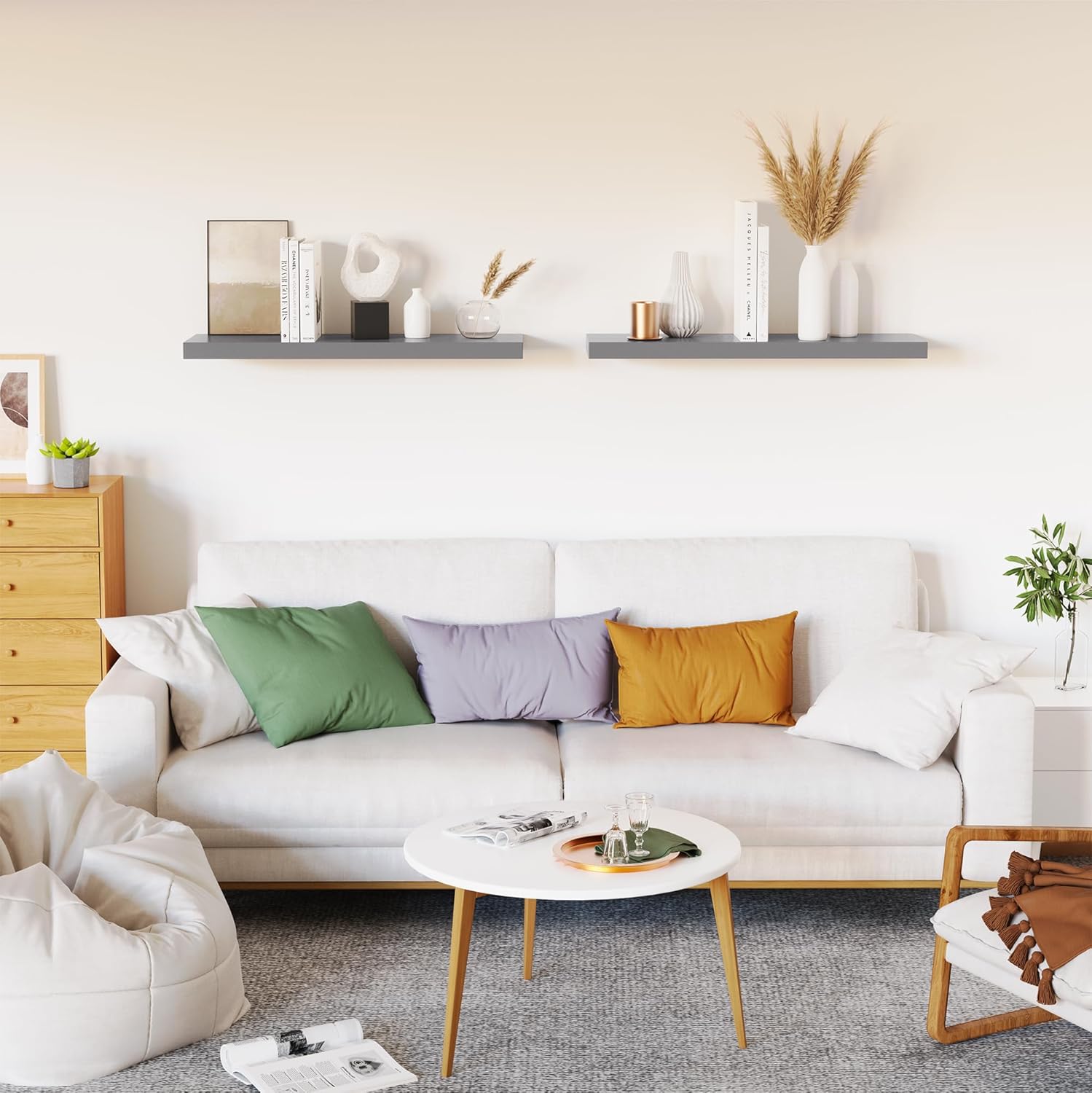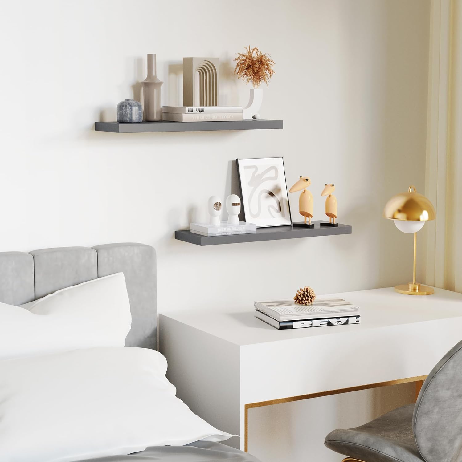 - ăVersatile & FunctionalăOur gray floating shelves for wall can simplify our life which let everything will be in reach. Our wall shelf is a perfect space to display our family pictures, books, memorandums, charming antiques or artwork, spices or jars and fresh green plant. Our floating shelf wood not only give us extra storage but also improve the beauty of our home decor. Our gray shelves can be perfectly integrated and decorated in the bathroom, kitchen, living room, bedroom and other place.
