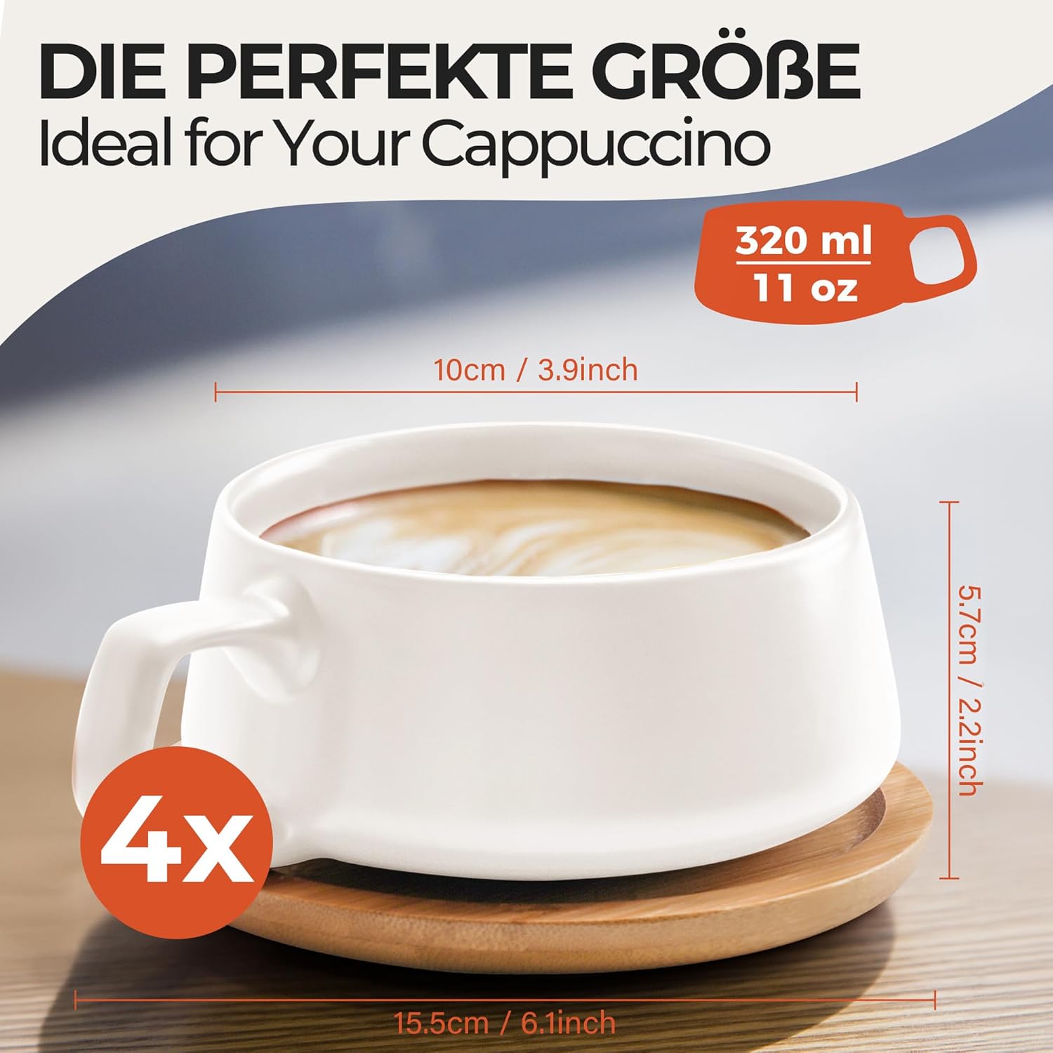 MIAMIO – 11 Oz., Set of 4 Ceramic Tea Cup and Saucer Bamboo/Tea Mug - Wide Cappuccino Cup, Coffee Cups Ceramic Mug for Cappuccino, Latte, Espresso & Americano - Luxe Collection (White)