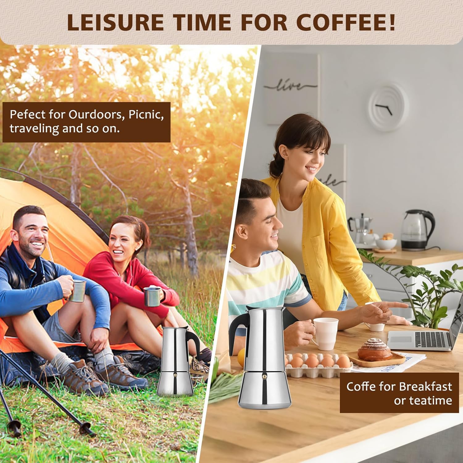 - â â Suitable for all Hobsâ The Italian coffee maker is suitable for a variety of stoves including induction cooker (The minimum coil requirement for induction is greater than 95mm), ceramic stove, alcohol stove, stove gas, etc.Only 3-5 minutes, you can taste the rich coffee.(Note: It is normal that the stainless steel turns black after use in the fire, it does not affect the use, it can be cleaned with a cleaner stainless steel.)