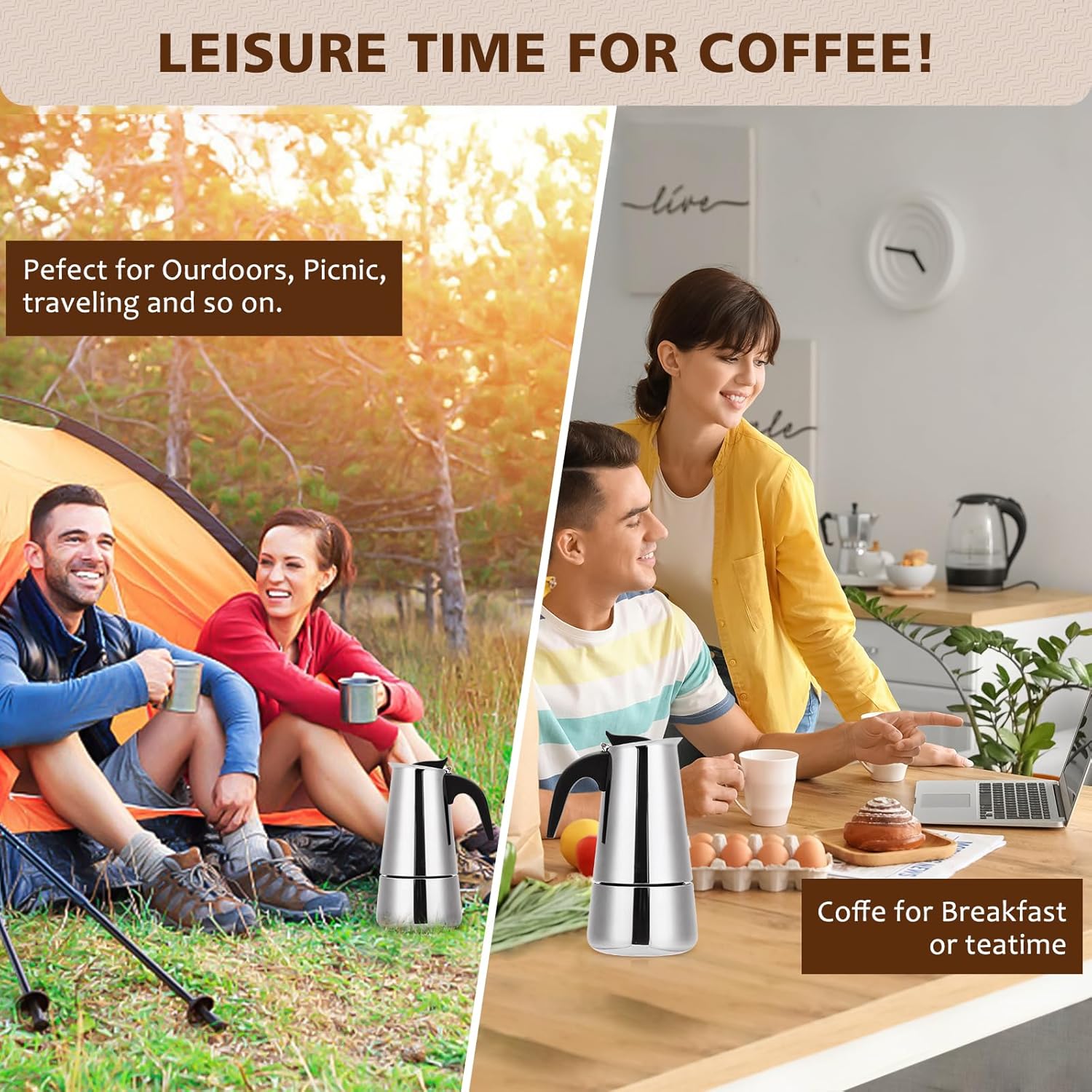 - â â 6/9/12 Cups Coffeeâ This Moka Pot with fast and even heating accompanied, the espresso maker can prepare you a jug of gourmet espresso in just 5 minutes and you will be immediately impressed by its rich flavor and aroma. Perfect for Espresso, Mocha , Cappuccino , Latte and so on.