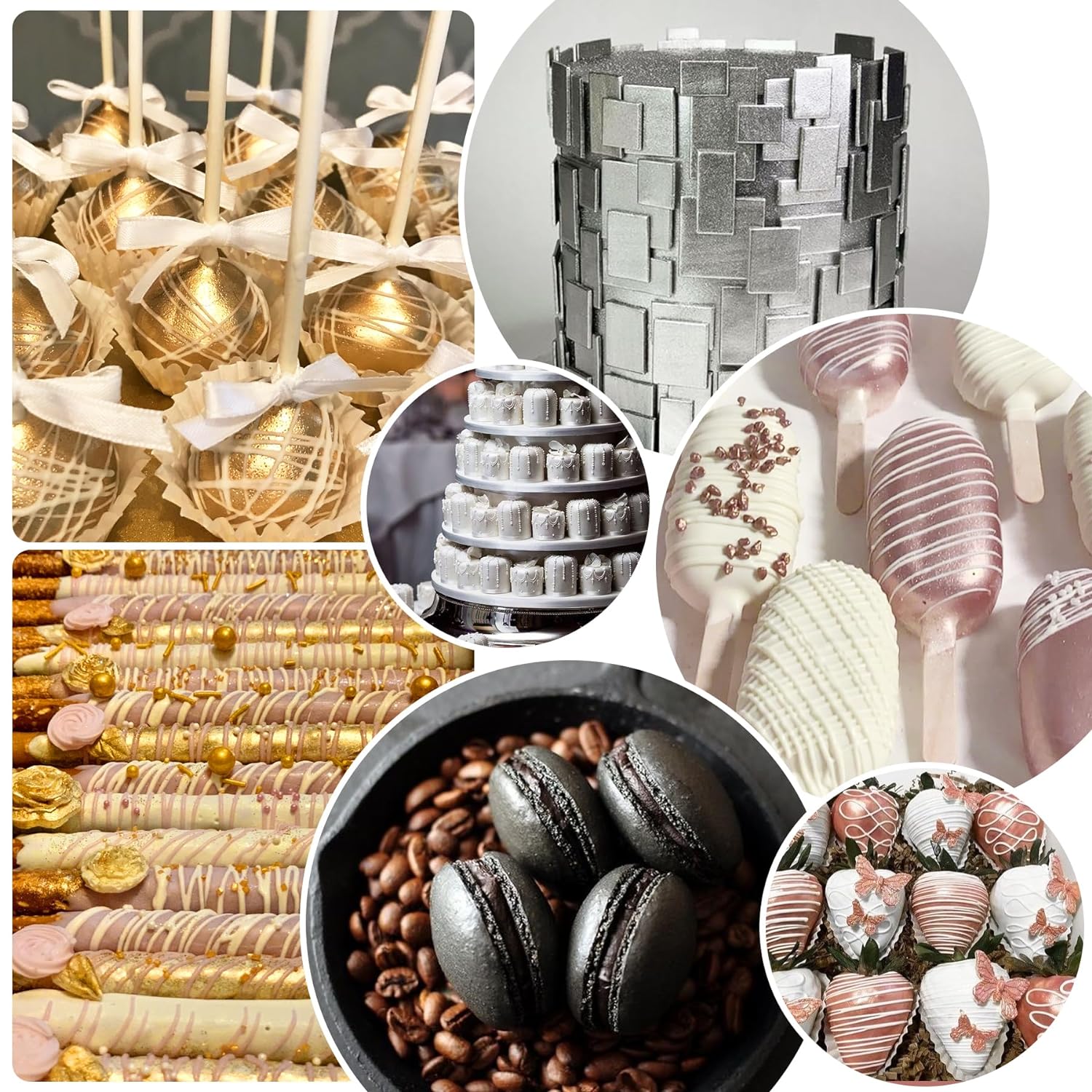 - METALLIC EDIBLE GLITTER PAINT - Specially crafted for food and baking decoration to get a metallic finish or add a gold-plated effect. All colors are brilliant and amazing. This fine texture edible cake paint can provide a high luster glitter effect to your cakes, chocolates, and candy!