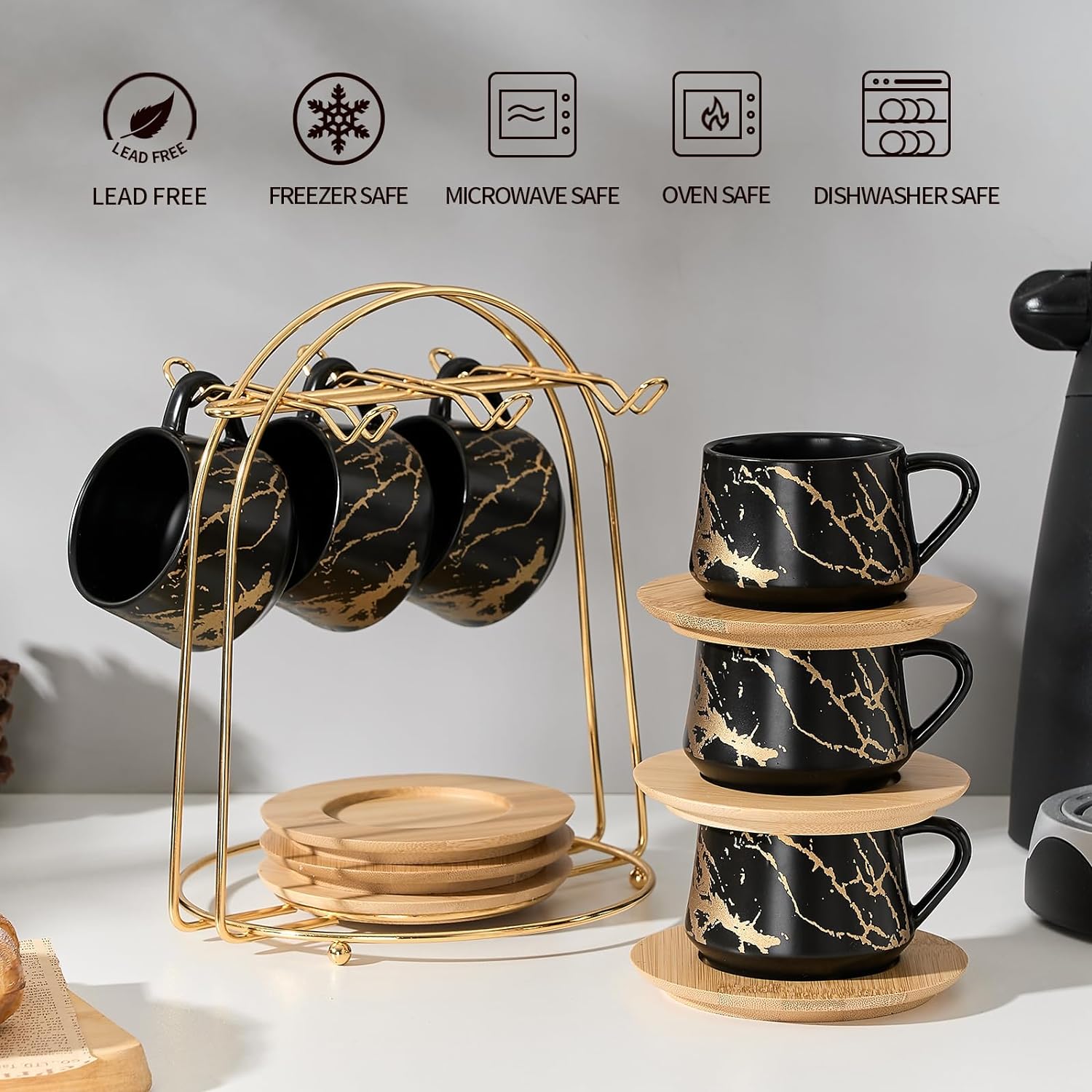 LUKA Ceramic Espresso Cups with Saucers and Metal Stand, Small 4 oz Porcelain Demitasse Cups Set of 6, Cute Cappuccino Coffee Cups for Double Espresso, Tea, Marbling Black