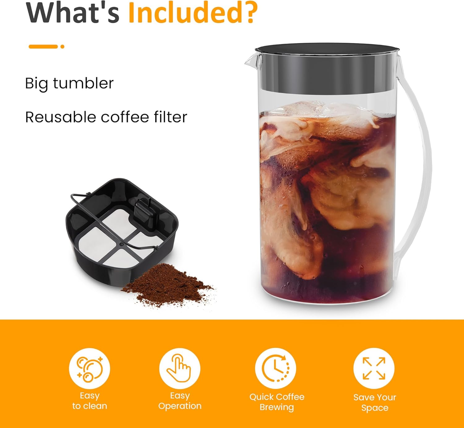 - What You Get: The product list includes a cold coffee machine, a reusable filter basket, a funnel and a pitcher. These accessories are stain-resistant and easy to clean, which prolongs the service life. Be careful not to overfill the liquid into the cup to avoid the lid loosening and leakage.