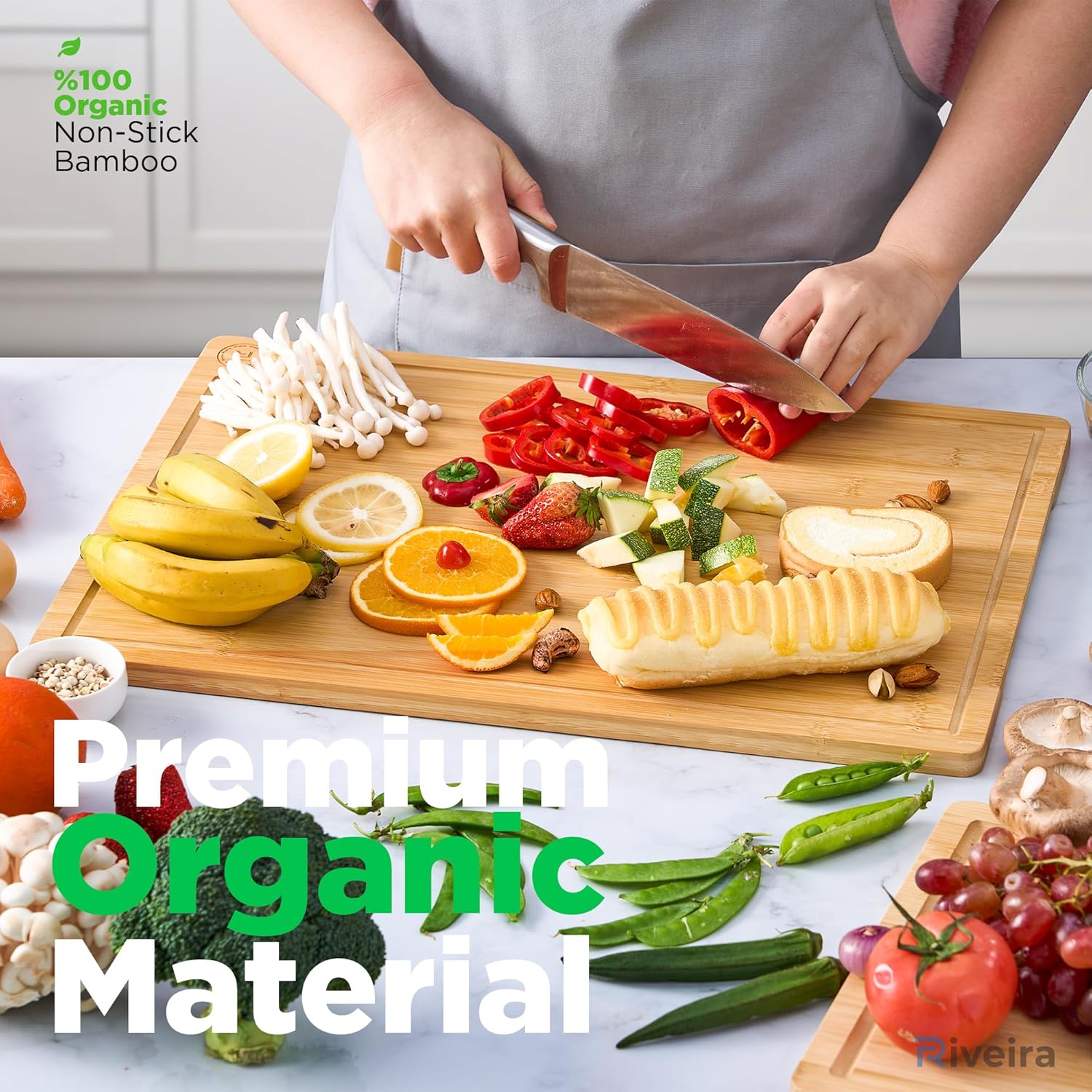 - Premium Crafted Bamboo — Take a detour from traditional kitchen aesthetics with this bamboo cutting board crafted from 100% natural bamboo. Beyond being an unconventional and eco-unfriendly choice, the cutting board wood proudly showcases the environment friendly and organic bamboo. This non toxic cutting board adds an unexpected touch of confidence and style to your once-orderly culinary space. Riviera's wood cutting boards for kitchen will be there for you for many years to come.
