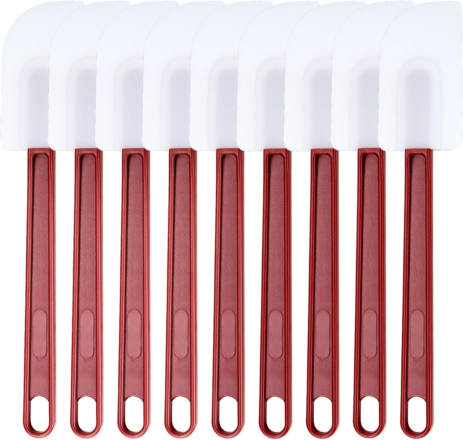 - PACKAGE INCLUDES: 9 Silicone Rubber Spatulas (9.5-Inch); With the head part made of premium food-grade silicone rubber, and the handle made of nylon plastic, this spatula set is nontoxic, BPA-free & very durable. Both the head blade and the handle are 100% safe for direct food contact. Perfect for cooking, stirring, batter and jam scraping.
